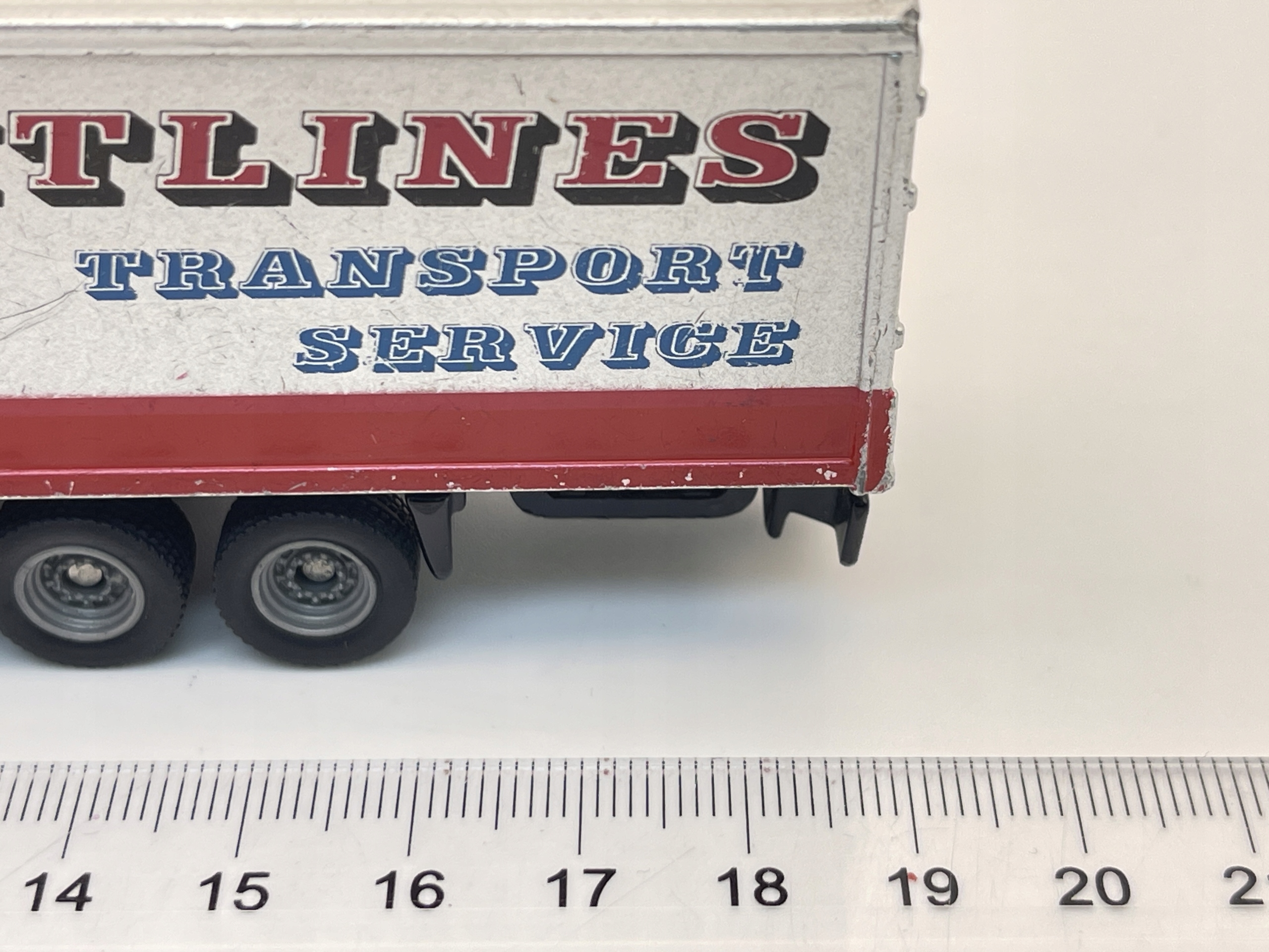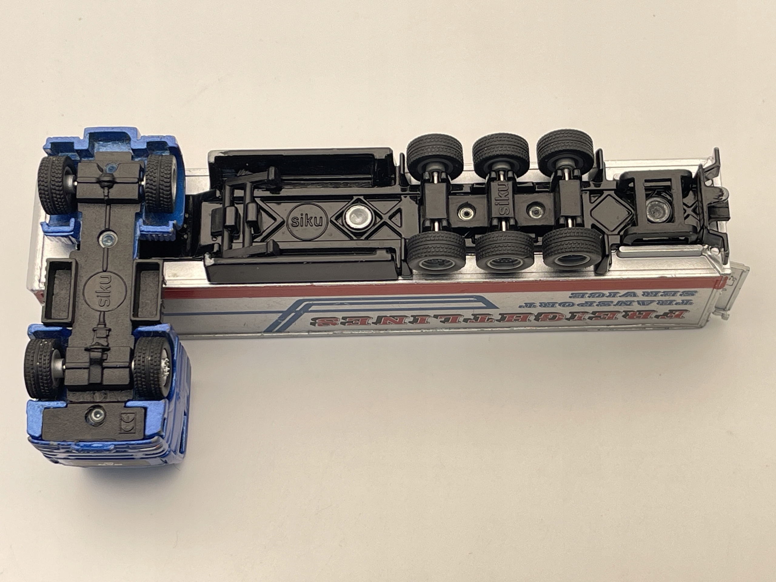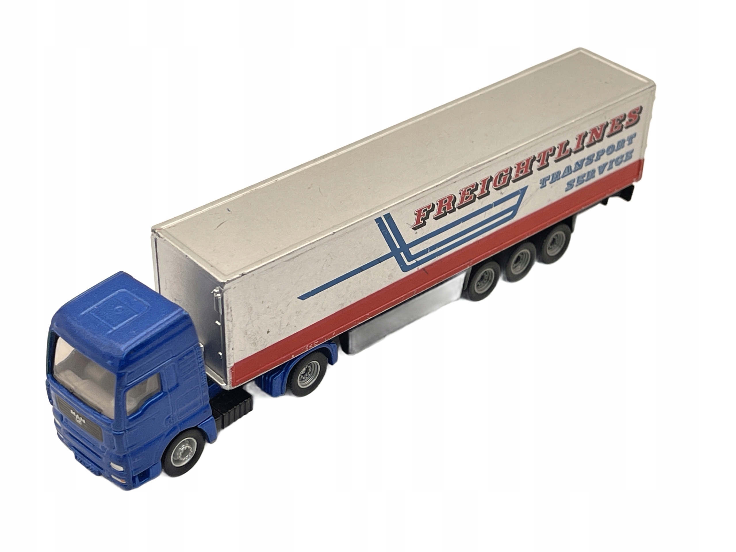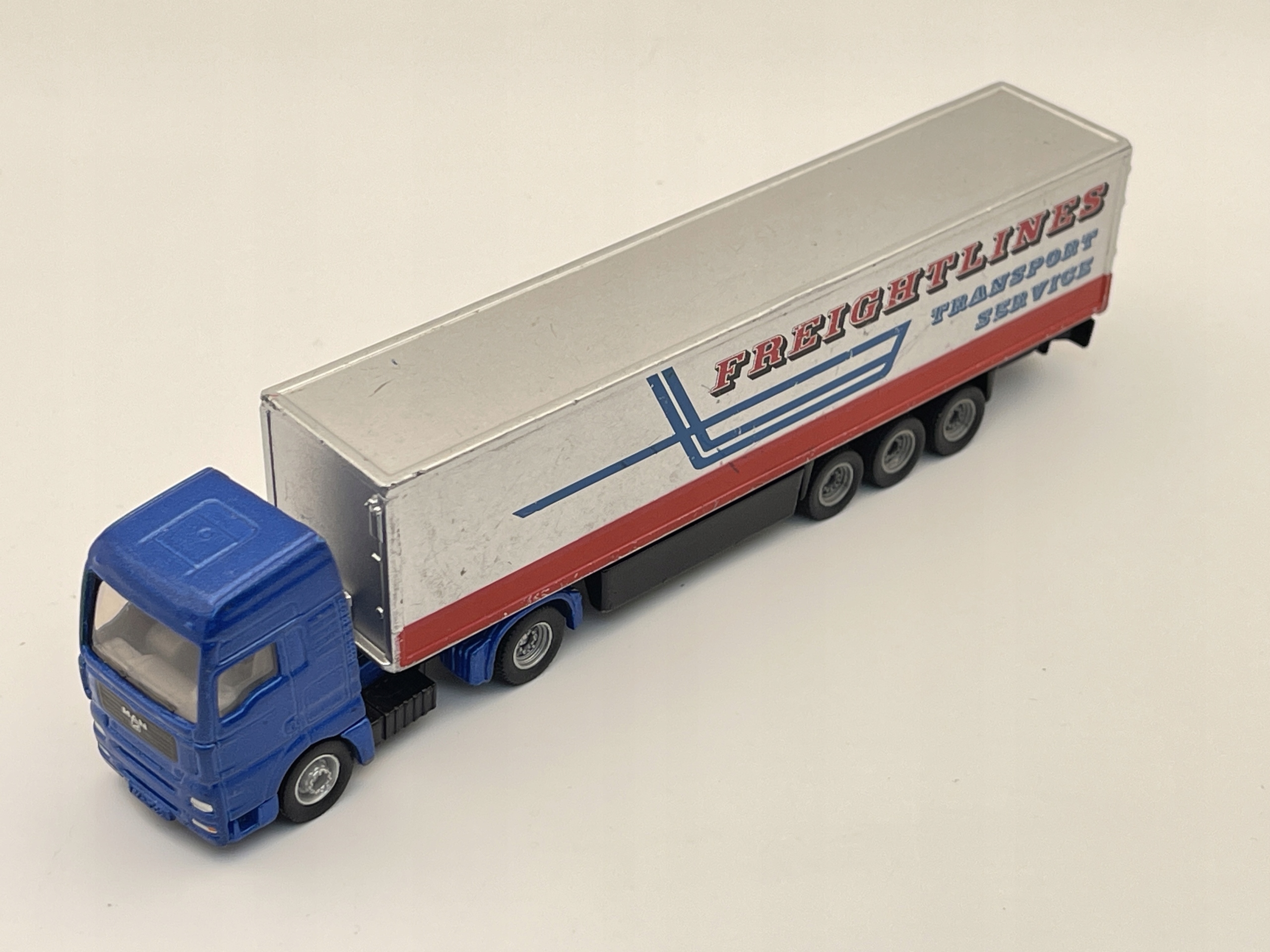 Подвеска MAN TGA от Siku – это уникальная модель грузовика с полуприцепом, которая привлекает внимание своей прочной конструкцией из металла и пластика. Модель имеет классическую цветовую схему с синей кабиной и серебристым прицепом, украшенным надписью «FREIGHTLINES TRANSPORT SERVICE» красного и синего цвета. Особенностью является открывающаяся дверь прицепа, что добавляет реалистичности и функциональности. Длина модели 228 мм и масштаб 1:87 делают ее идеальной копией настоящего грузовика. Несмотря на оценку состояния 3,50 из-за мелких царапин, модель сохраняет свой шарм и является ценным дополнением к любой коллекции.
