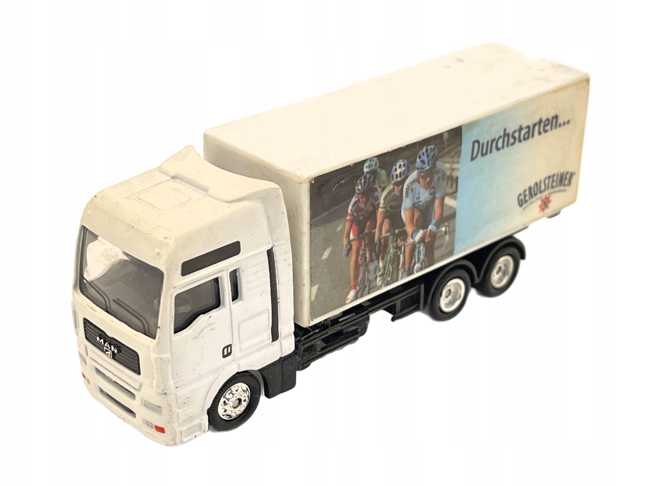 Resorak представляет белый грузовик MAN с полуприцепом с рекламной графикой с велосипедистами и логотипом Gerolsteiner. Модель изготовлена из металла и пластика, что характерно для данного масштаба. Несмотря на то, что состояние оценивается на 3,50, есть видимые царапины и складки, оно по-прежнему выглядит привлекательно для коллекционеров.