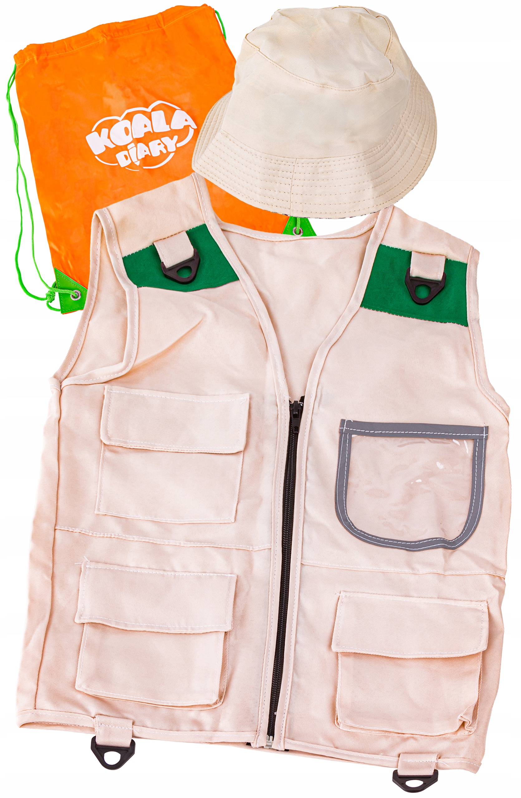 - жилет - имеет 4 кармана и крючки для крепления необходимых в данной экспедиции аксессуаров. Отдельные элементы имеют карабины, благодаря чему их можно легко прикрепить к жилету. Застегивается намолнию. Размеры жилета в разложенном виде примерно 38 х 48 см.