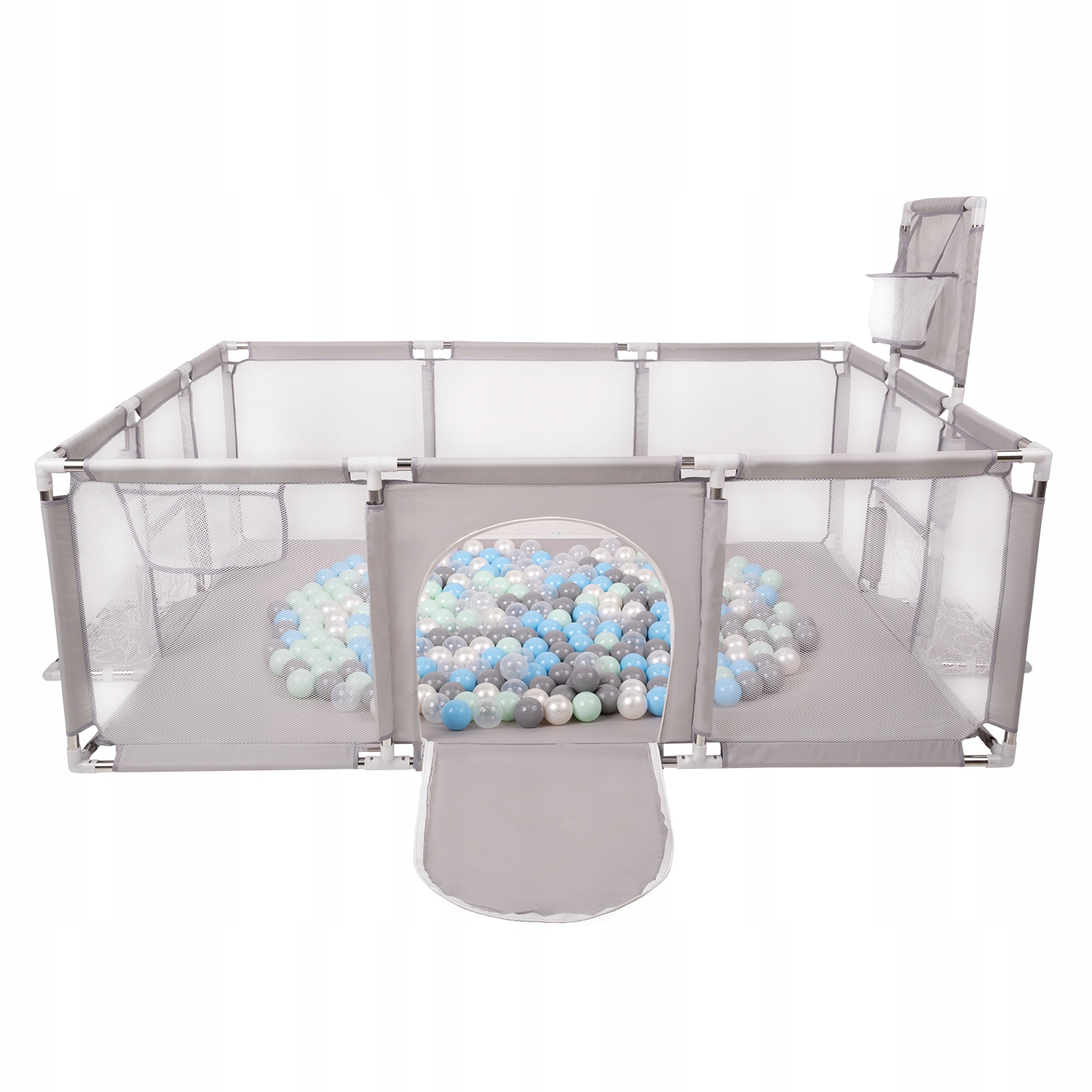 Складной манеж с пластиковыми шариками в форме мини-площадки подарит вашему ребенку массу удовольствия. Внутри достаточно места, чтобы несколько детей могли свободно играть. При этом манеж легко складывается, поэтому его можно спрятать или взять с собой в отпуск, на пикник или в гости к друзьям. На одной из стен установлена баскетбольная сетка, а на другой — футбольные ворота. Благодаря этому дети могут начать карьеру в командных видах спорта.