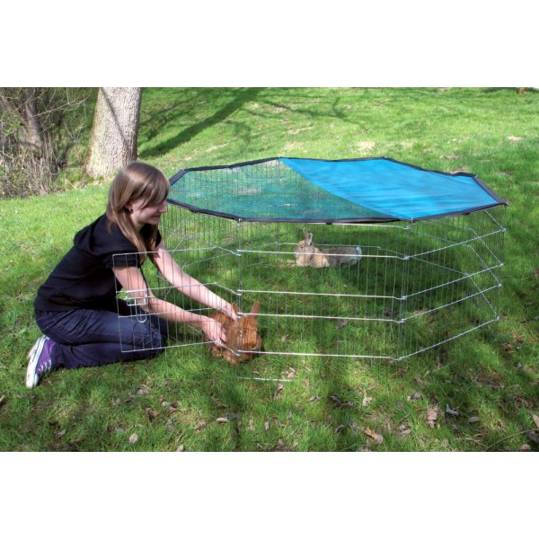 Высококачественный манеж оснащен дверцей и солнцезащитным материалом. Его можно использовать как для кроликов, так и для других мелких домашних животных, собак и кошек.