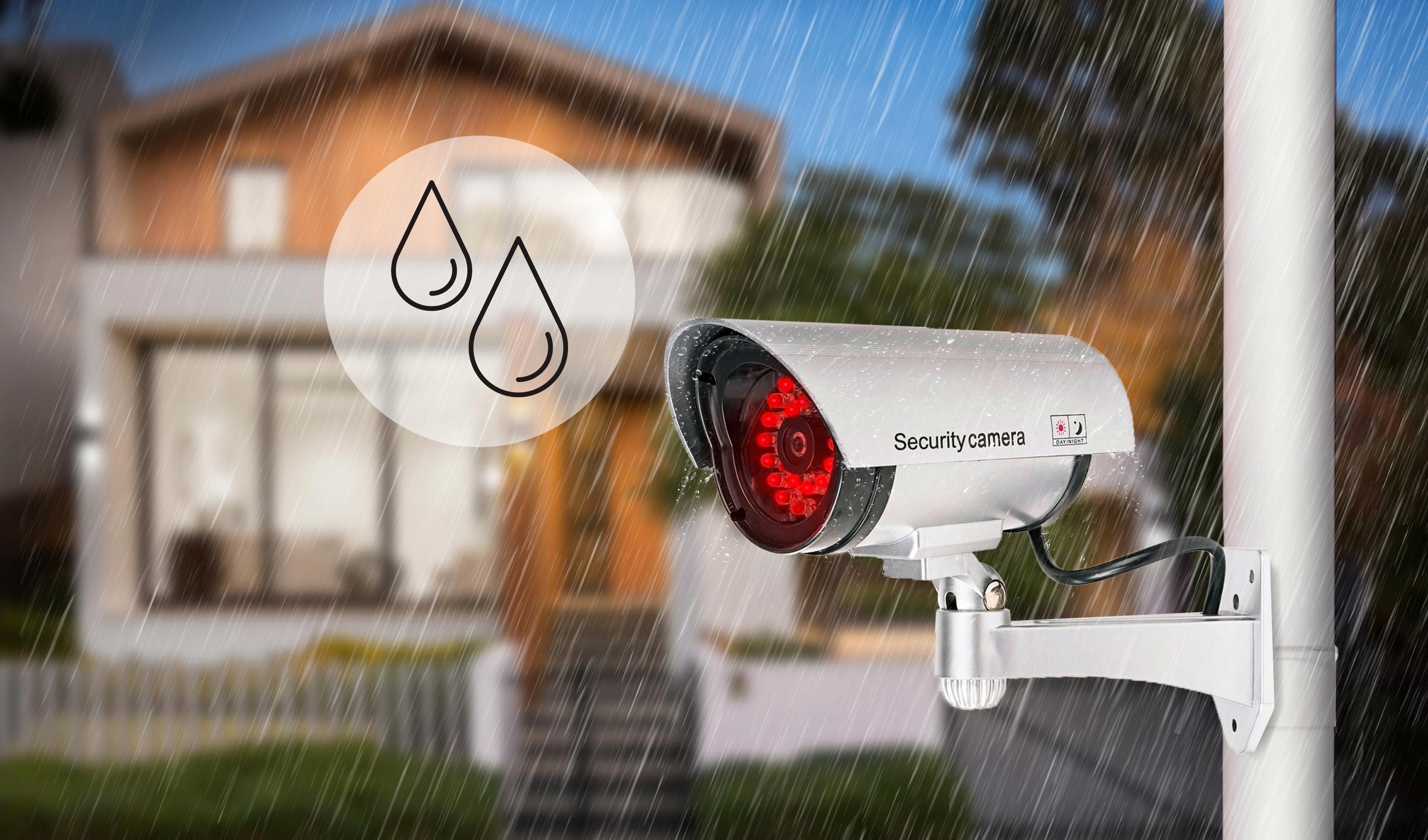 - Благодаря прочной конструкции и прочному материалу этот манекен камеры наблюдения отлично работает даже в экстремальных погодных условиях, таких как сильный дождь или осадки. снег.