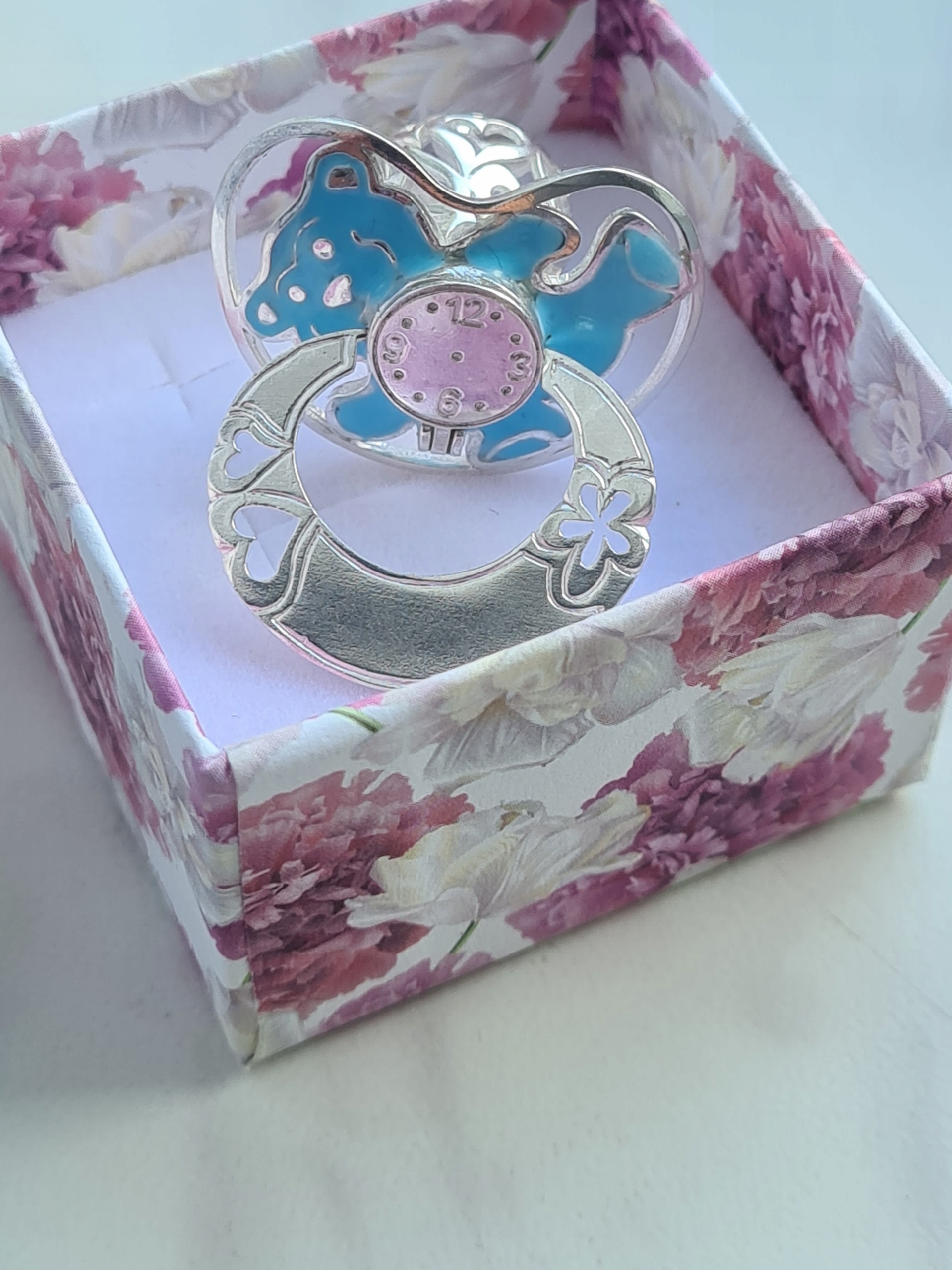 Серебряная соска для крещения малыша, создаётся, как правило, к рождению нового члена семьи. Открывающиеся часы с местом для первого зуба