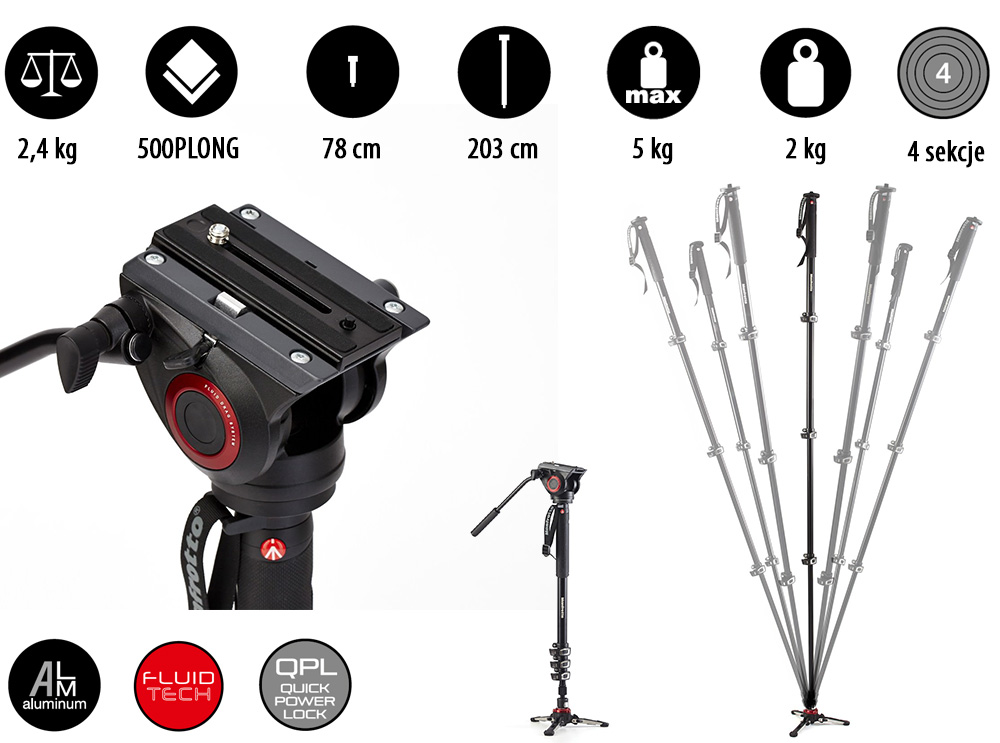Оригинальный видеомонопод Manfrotto XPRO, 4 секции, видеоголовка (500PLONG)