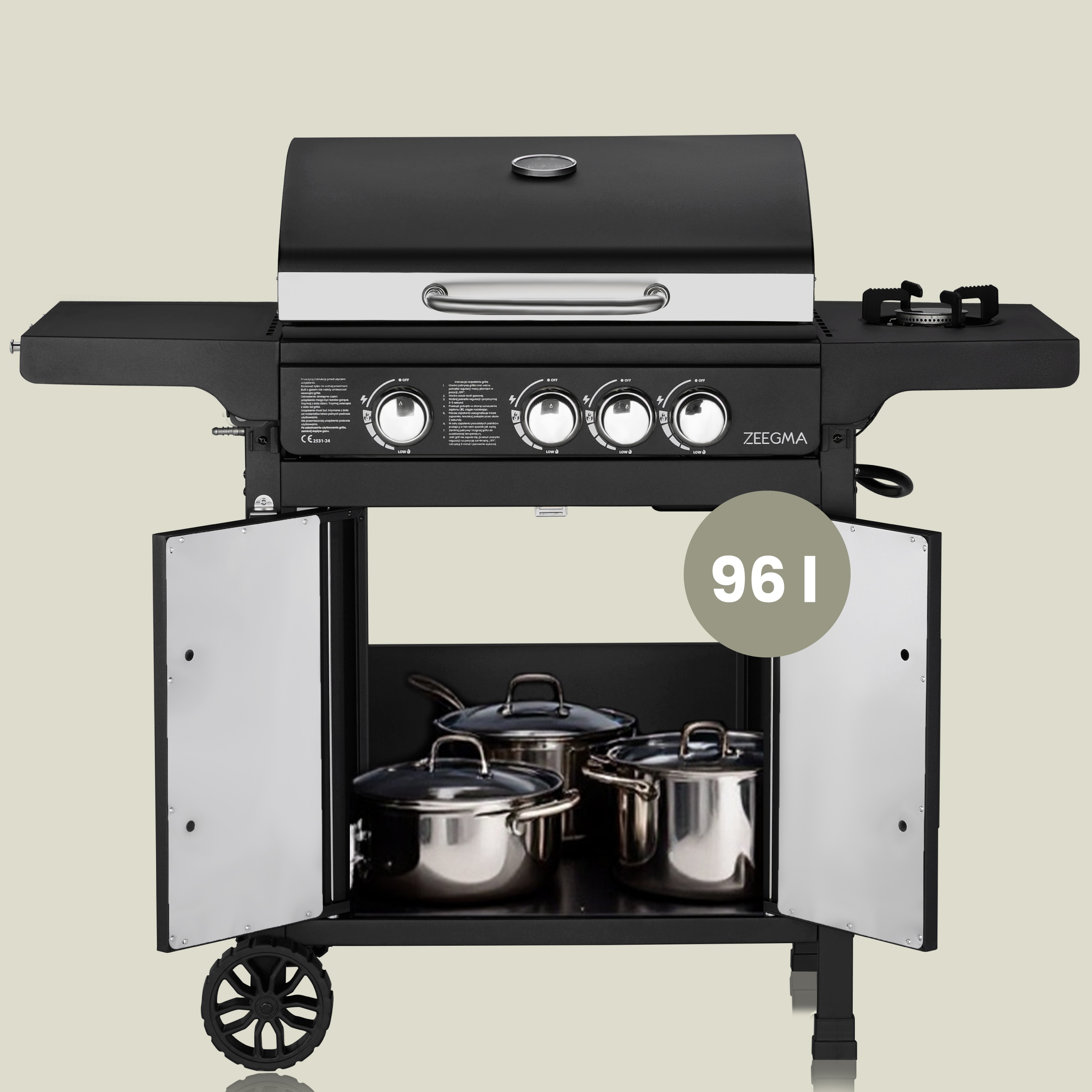 с газовым грилем fuego 3+1 Вы можете начать на гриле через 5 минут . Благодаря высокой мощности устройства 11,2 кВт (каждый из главных горелок имеет 3 кВт, а боковая горелка 2,2 кВт) быстро нагревается .