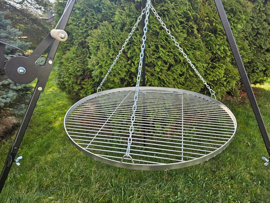 Штатив оснащен рукояткой для регулировки высоты решетки, веревкой, оцинкованные цепи и карабины для подвешивания решетки.