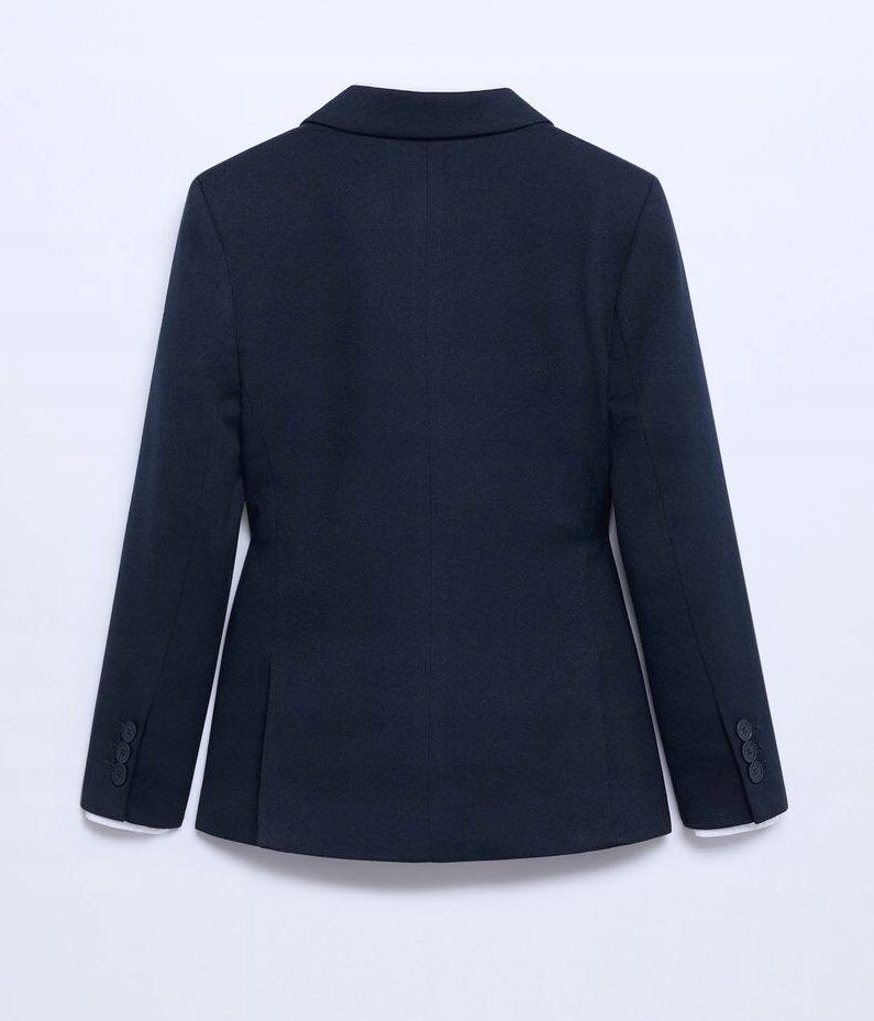 Высококачественная куртка, с стройной срезом. Сделано из темно -синего материала с примесей вискозы. Закреплено двумя кнопками. Морские закрылки с порезами, вырез в шпице. По бокам он имеет два кармана с флип -клапанами, на груди Брюсе.