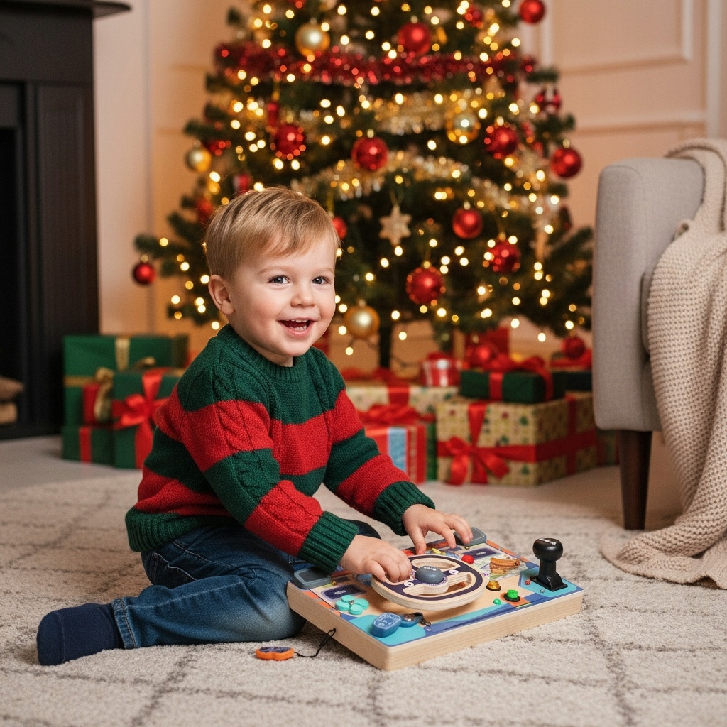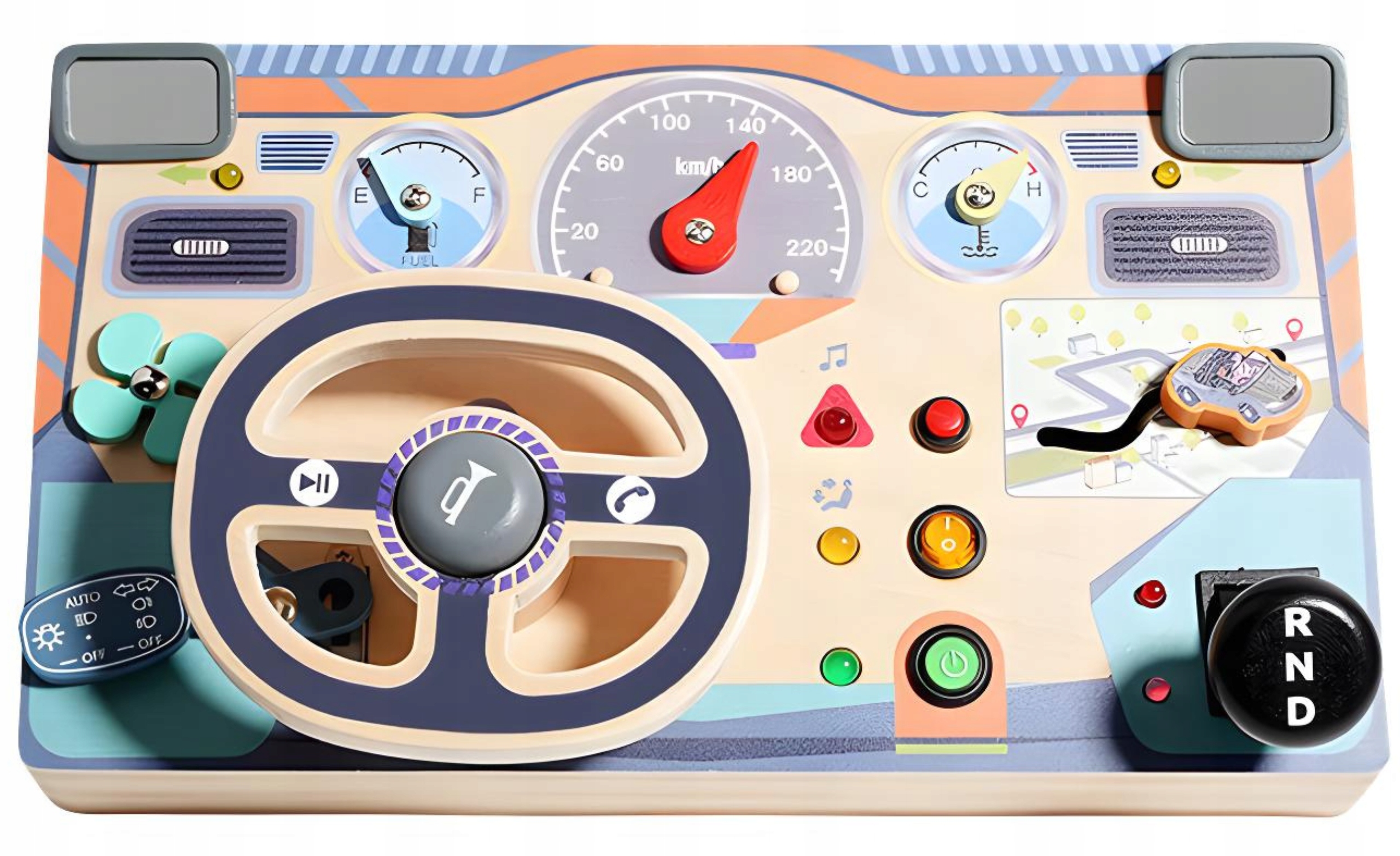 Это реалистичная автомобильная панель в версии, удобной для детей, полной движущихся элементов, переключателей, огней и звуков. Идеально подходит для развития мелкой моторики, координации и стимулирования воображения.