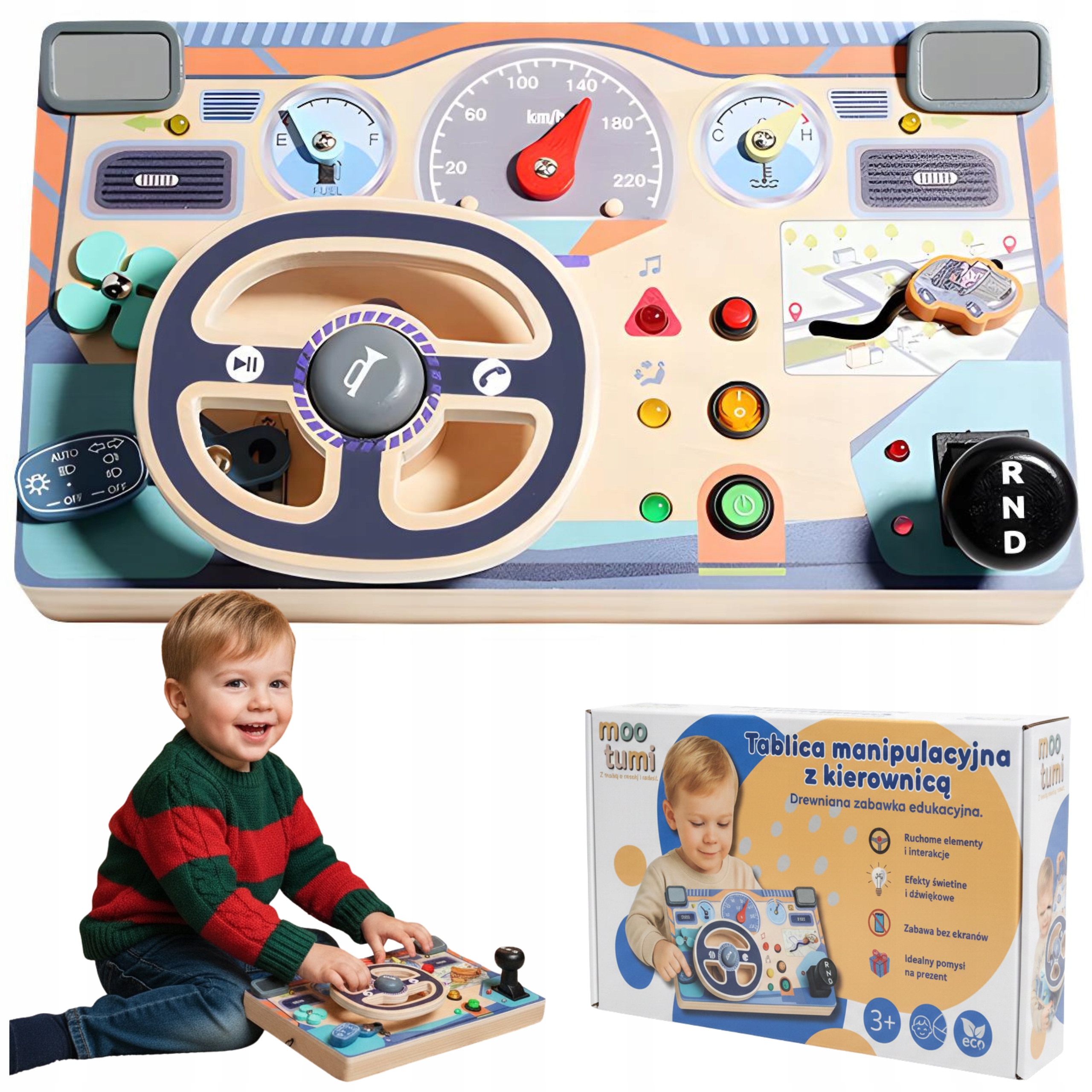МАНИПУЛЯЦИОННАЯ ДОСКА МАШИНКА С РУЛЕМ ДЕРЕВЯННАЯ ИНТЕРАКТИВНАЯ СВЕТОДИОДНАЯ ИГРУШКА