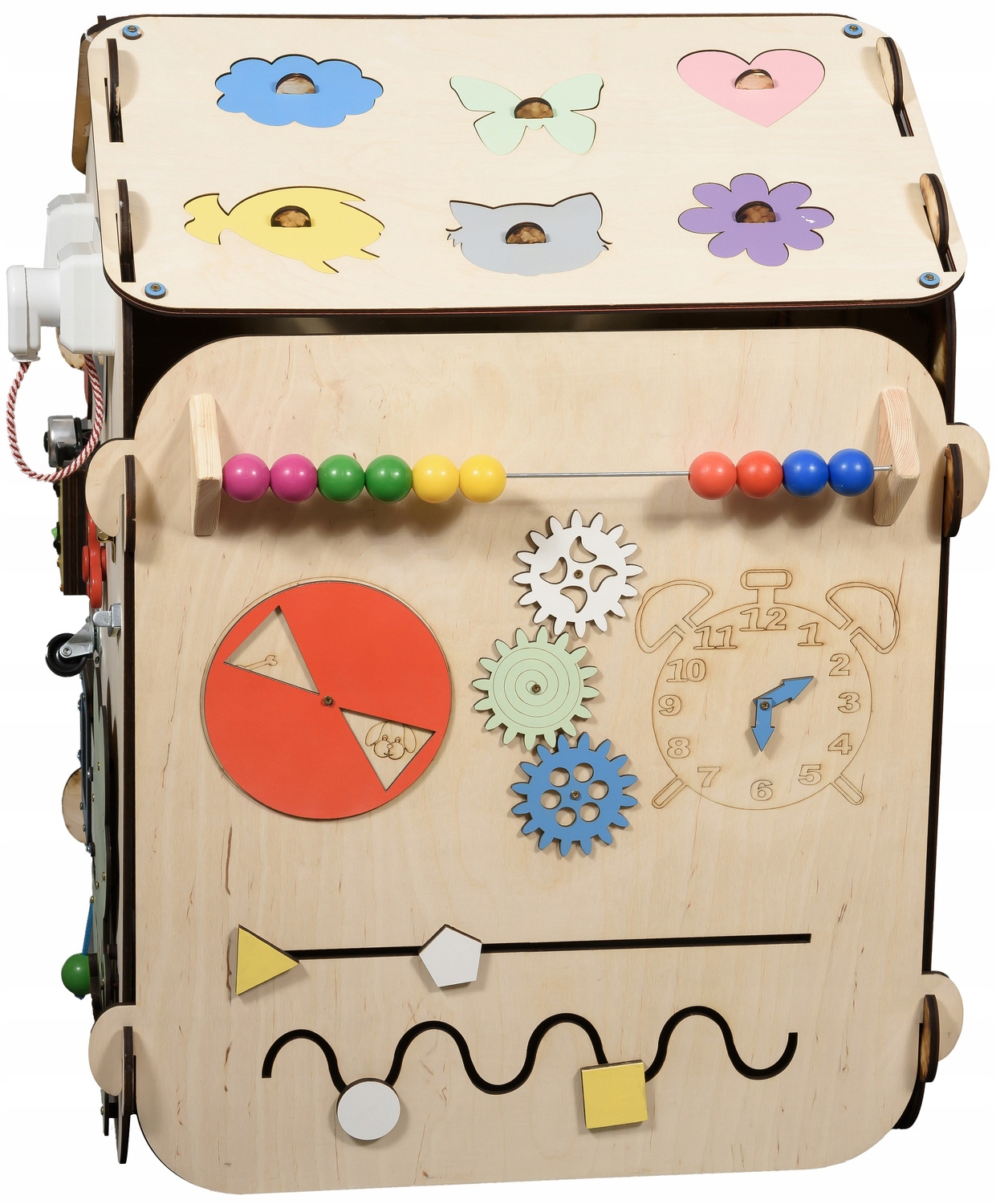 Сенсорный дом — отличная идея для творческого развлечения вашего ребенка. Обучение через игру – лучший способ правильного развития детей. Дом — идеальное место для тренировки первых букв, цифр и правил пешеходного перехода. Правильно подобранные движущиеся и игровые элементы помогут вашему ребенку развить творческие способности и мануальные навыки. Кроме того, это будет стимулировать его изобретательность и побуждать его исследовать окружающий мир. В домике есть открывающаяся дверь, что позволяет проникнуть внутрь или спрятать игрушки.