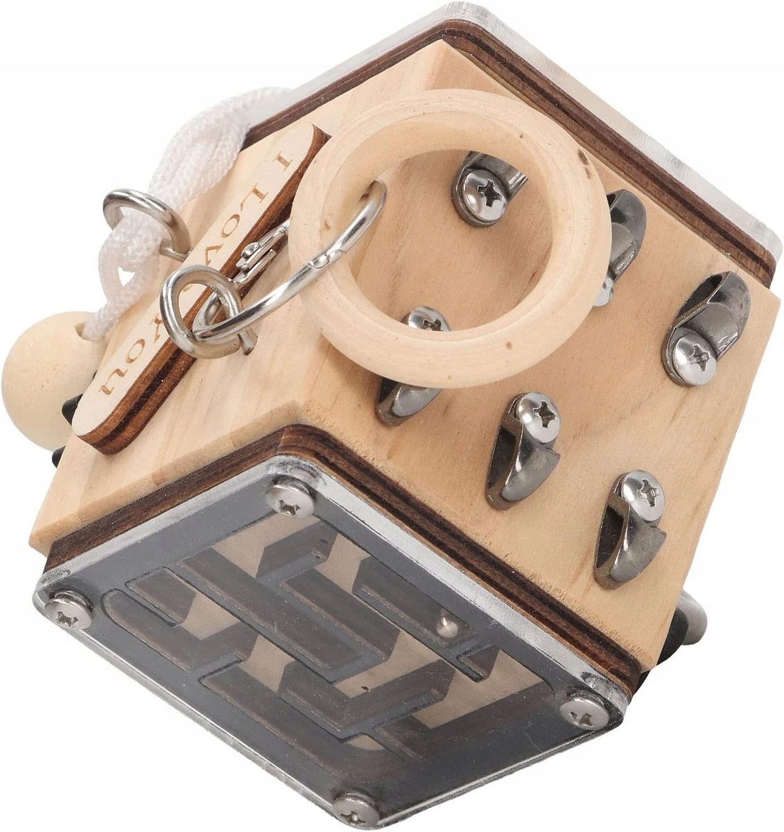 Куб из дерева с добавлением металлических элементов и верёвки, а также его отдельные стенки: