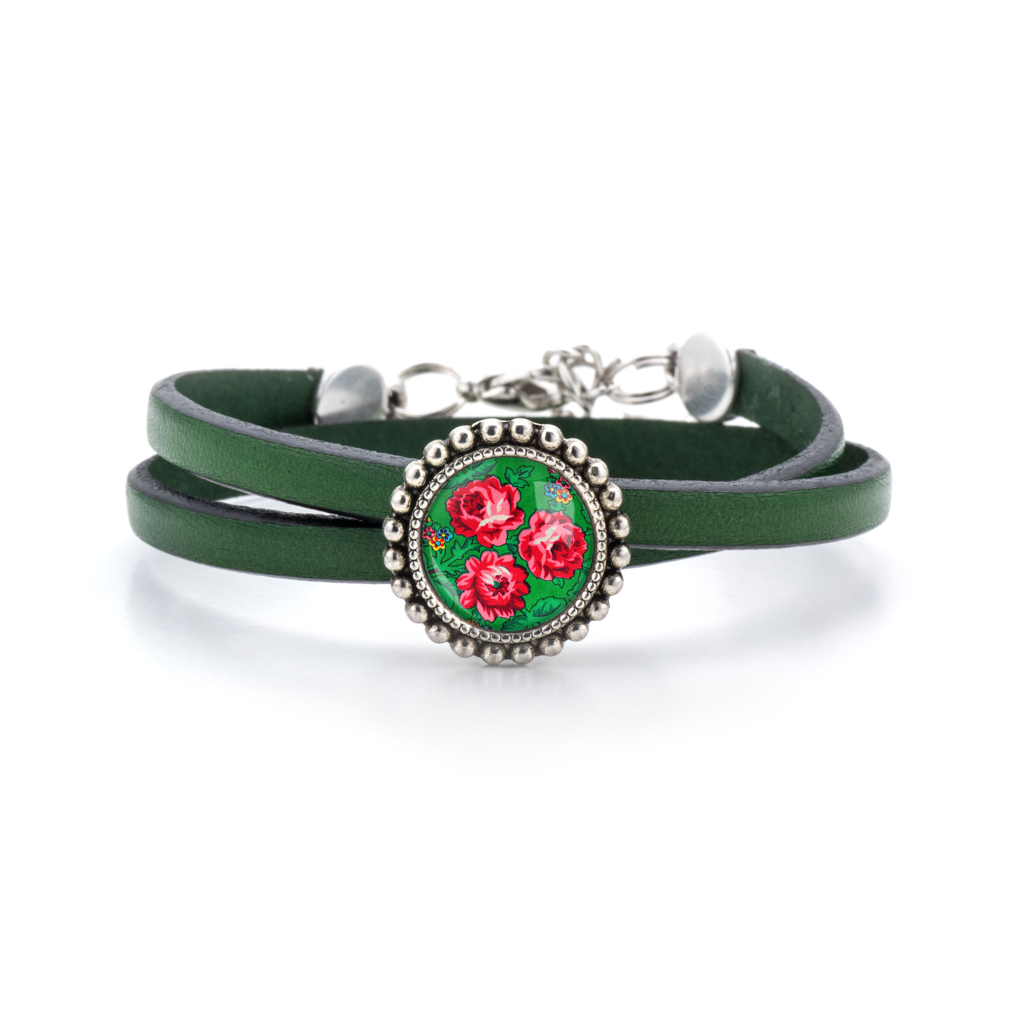 Браслет ручной работы, изготовленный из натуральных зеленых стрингов. Браслет украшен высококачественной графикой, закрытой под выпуклым серебряным слайдом из латуни >