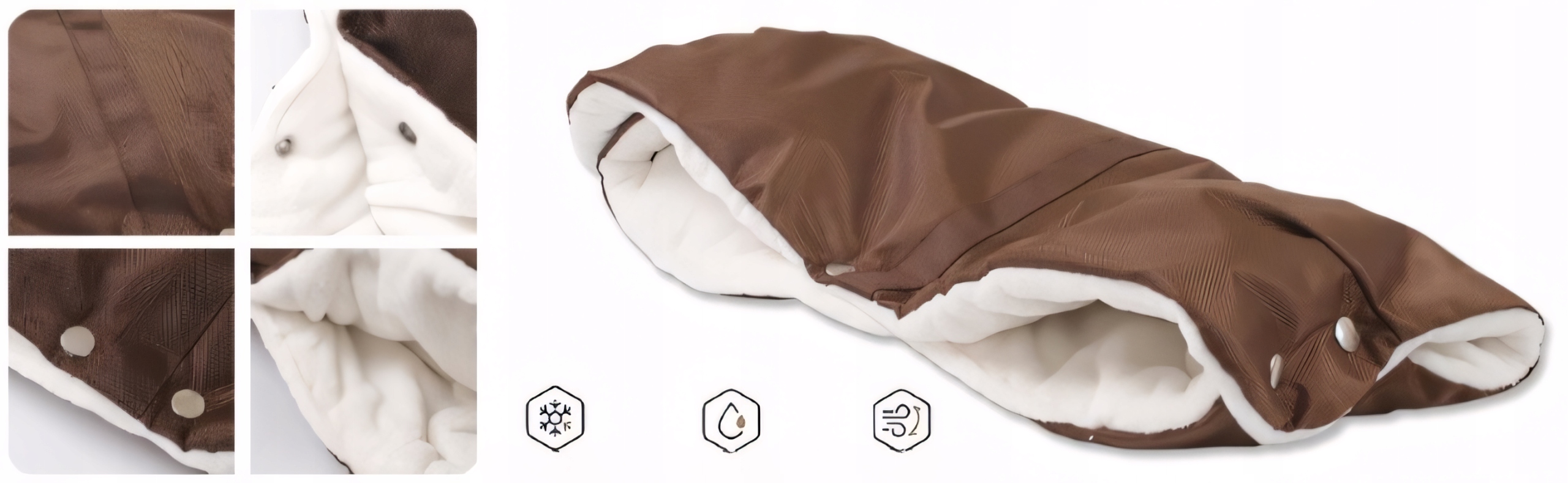 Выберите коричневую муфту для коляски, которая гарантирует теплые руки в любую зимнюю погоду. Создано с учетом вашего комфорта: водонепроницаемый внешний слой 1680D защищает от дождя и ветра, а мягкая фланелевая внутренняя часть плотно облегает кожу. Сборка происходит мгновенно благодаря защелкам, а универсальный размер подходит для 99% колясок. Вам больше никогда не придется снимать перчатки, чтобы ответить на звонок или поправить одеяло!