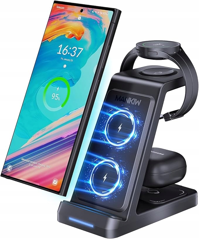 Зарядная станция Manics была специально разработана для пользователей устройств Samsung. Это позволяет одновременно заряжать смартфона, часы и наушники, обеспечивая комфорт, заказ и экономию времени.