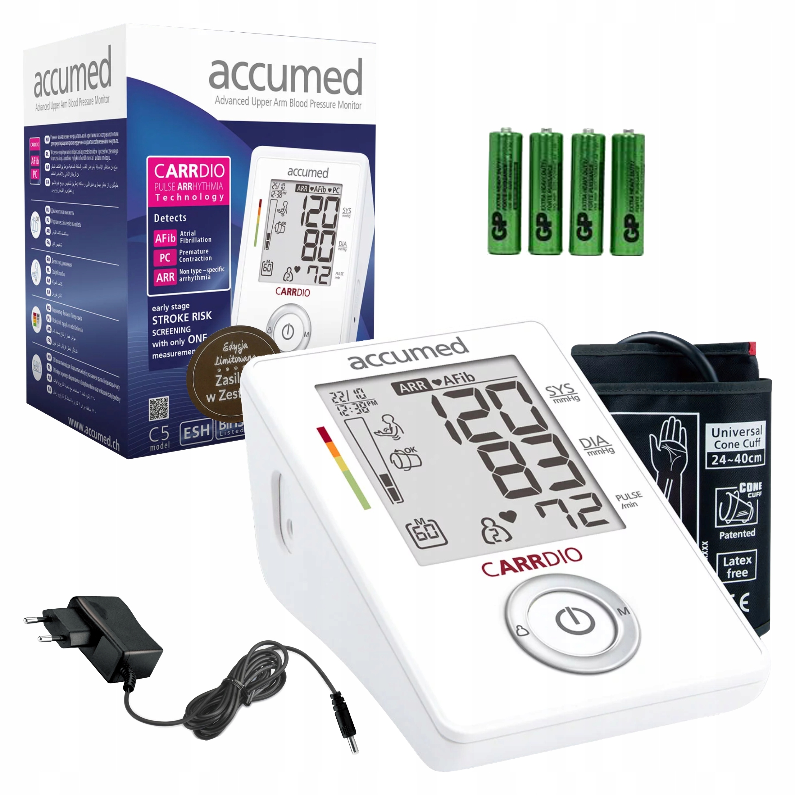 Современный, инновационный автоматический тонометр Accumed C5 Carddio — это продукт высочайшего качества швейцарской компании Rossmax. Полностью автоматический тонометр на плече был разработан с учетом комфорта и точности. Технология CARRDIO обнаруживает аритмию во время регулярных измерений артериального давления без дополнительных навыков пользователя или продления измерения. Эта технология предотвращает риск сердечно-сосудистых заболеваний и инсульта за счет раннего выявления фибрилляции предсердий и преждевременных сокращений сердца. Технология Real Fuzzy обеспечивает надувание гильзы до нужной величины, что гарантирует еще большую точность. Для вашего удобства использована еще лучшая, качественная, запатентованная, уникальная коническая манжета, удлиненная в размере 24 см - 40 см, что обеспечивает очень точные измерения, проще в использовании и экономит время при измерении артериального давления. Уникальный значок правильно надетой манжеты показывает, правильно ли наложен рукав. Большой дисплей позволяет легко считывать значения систолического, диастолического и пульсового давления после каждого измерения. Встроенная память позволяет хранить до 2 x 60 последних результатов измерений вместе с указанием даты и времени измерения, что очень удобно для двух пользователей, которые хотят регулярно проверять и наблюдать за своим артериальным давлением. Функция автоматического отключения снижает расход заряда батареи, а использование источника питания позволяет проводить измерения тогда, когда это необходимо больше всего.