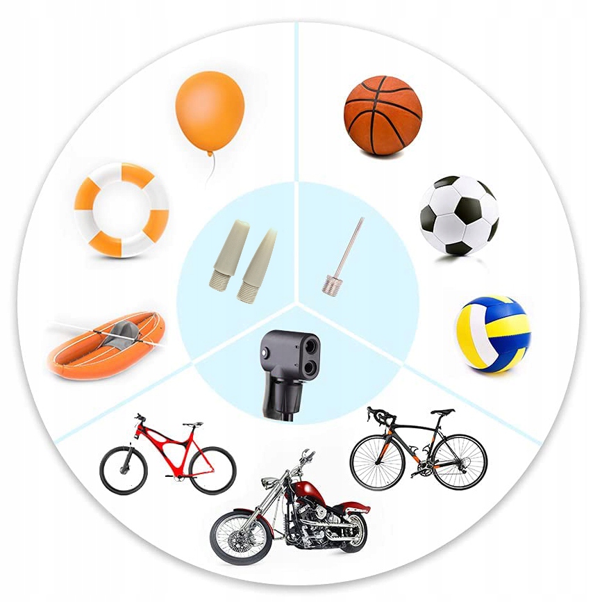 Имеет двойную универсальную головку для автомобильных и велосипедных клапанов. Дополнительно в комплект входят переходники и игла для надувания матрасов, мячей, надувных игрушек и т.п.