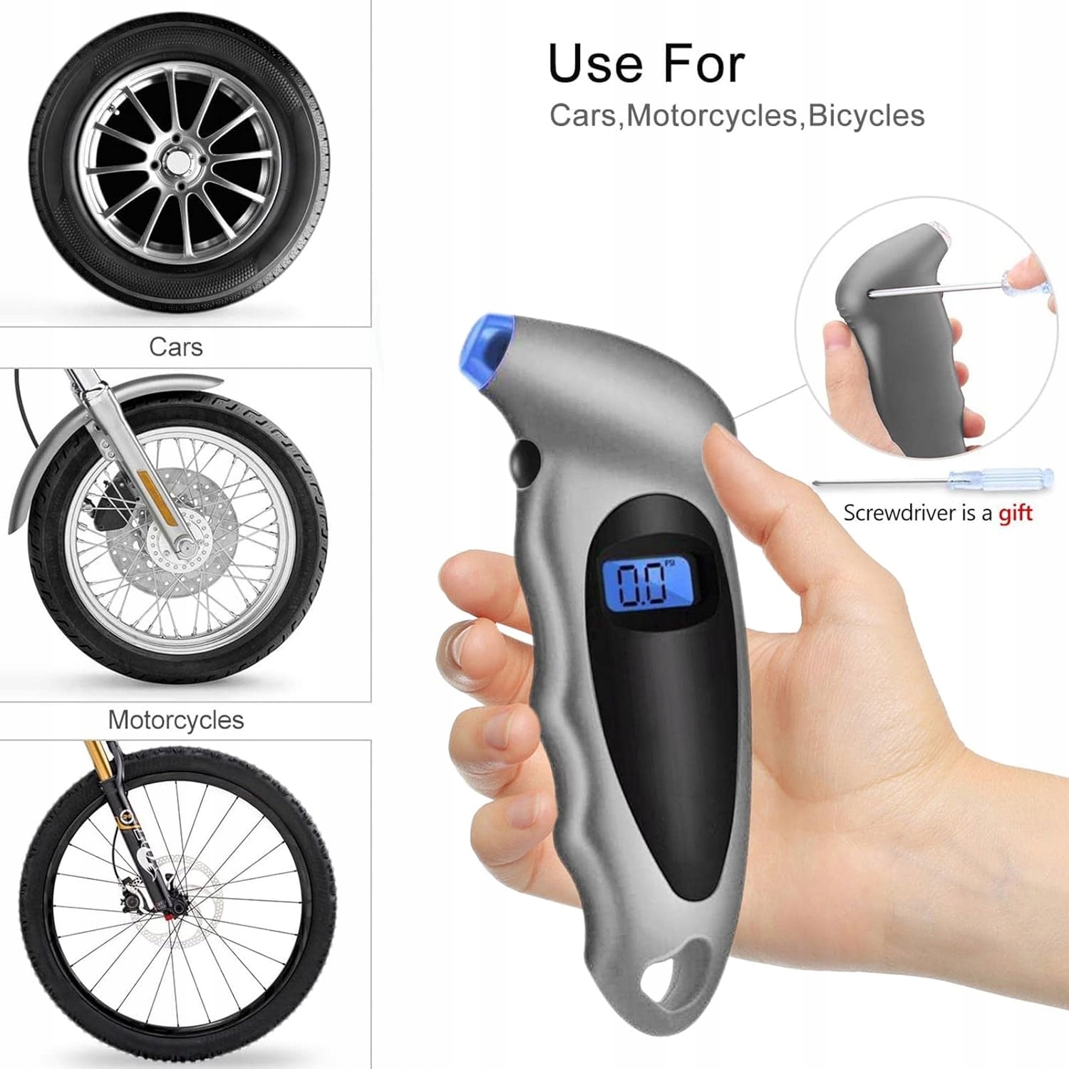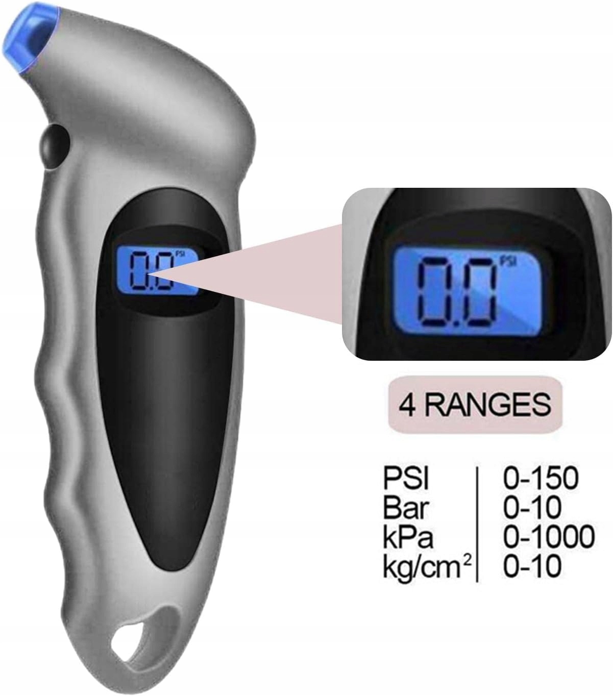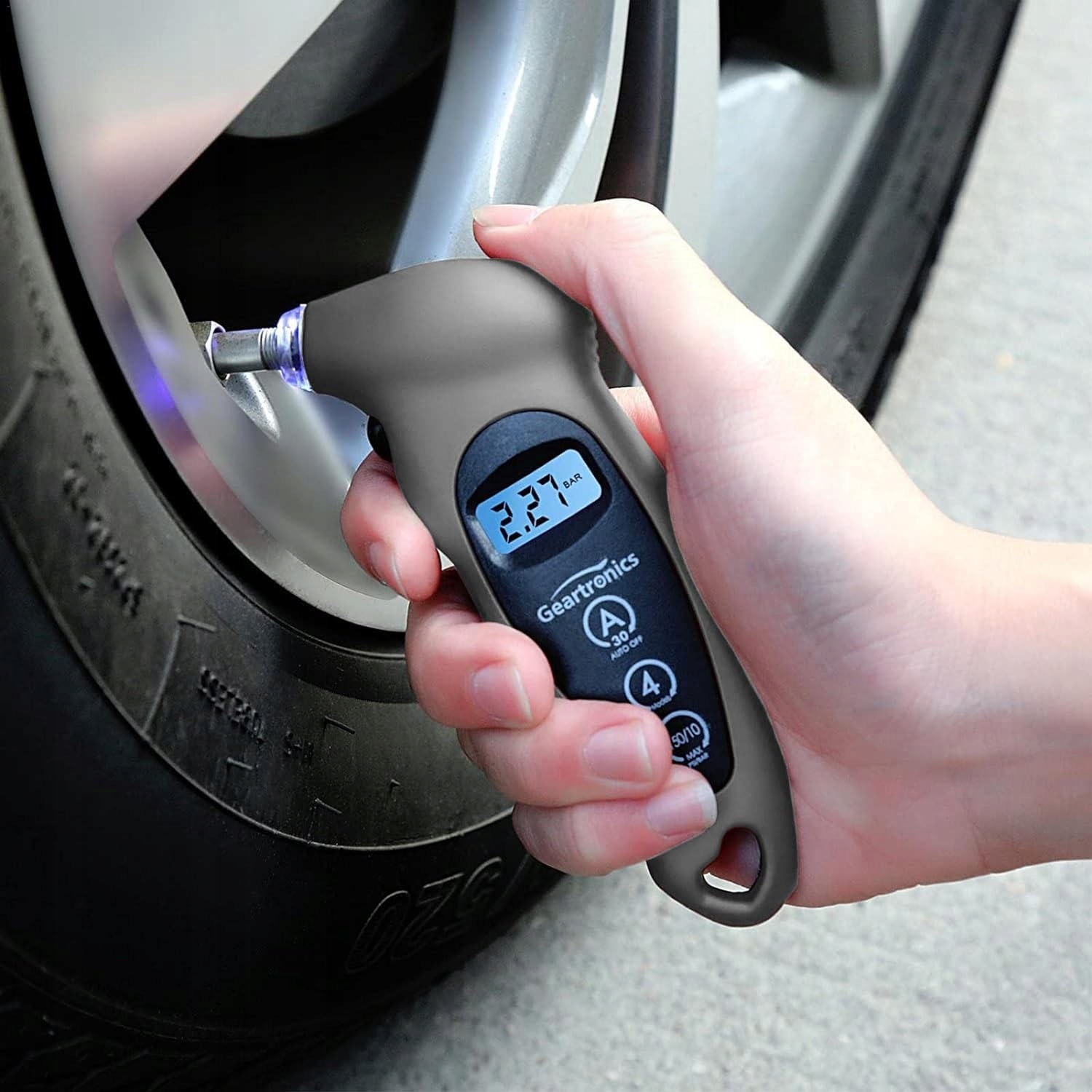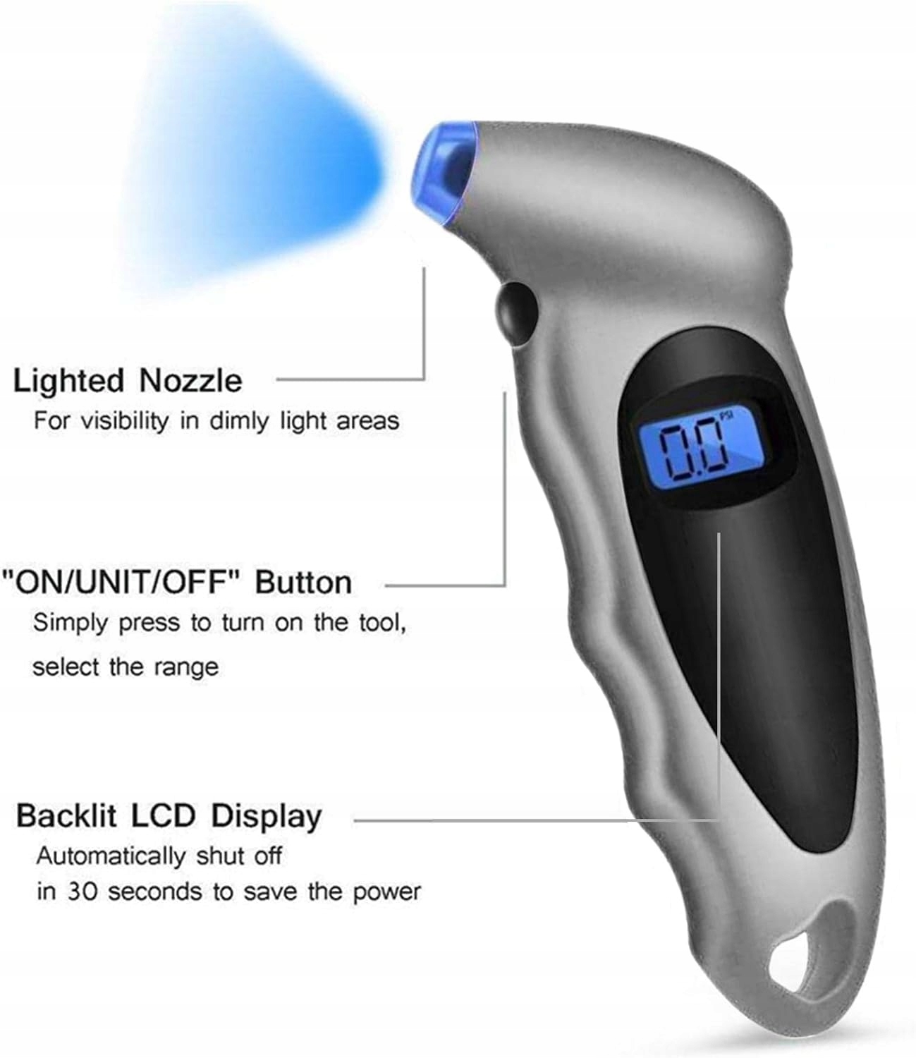 Удобство и точность Он не только легкий и портативный, но и цифровой манометр для шин имеет герметичное сопло, которое легко скользит по штоку клапана, обеспечивая точное уплотнение. Полезный ЖК-дисплей с подсветкой Благодаря светодиодам с подсветкой автомобильный манометр позволяет точно считывать данные даже ночью или в темных местах, где необходимо проверить давление в шинах. Простота в использовании После 30 секунд бездействия индикатор давления в шинах автоматически отключается и можно легко выбрать нужный блок и подключить его к вентилю шины. Противоскользящая ручка Благодаря противоскользящей рукоятке, которая надежно прилегает к руке, и эргономичному дизайну, измерение давления в шинах с помощью манометра воздуха обеспечивает комфортную работу. Универсальное применение За исключением выноса Presta, манометр для шин можно использовать в легковых автомобилях, грузовиках, велосипедах, мотоциклах и других транспортных средствах для поддержания надлежащего давления в шинах.