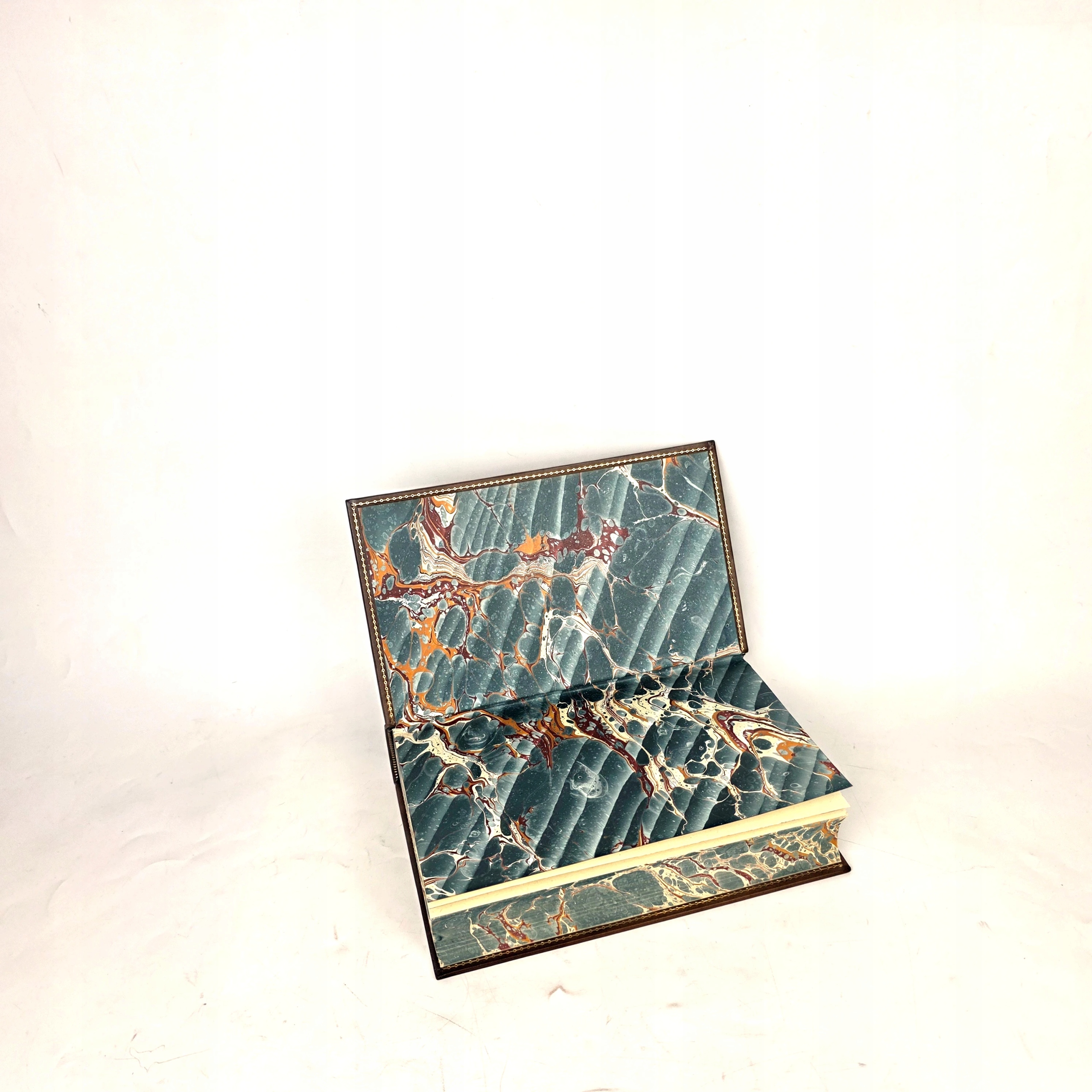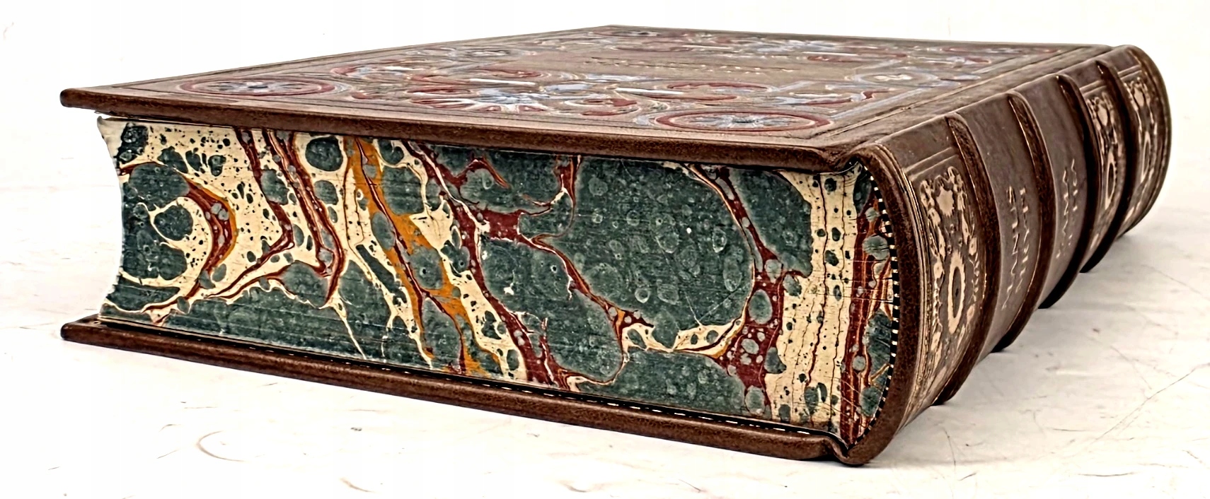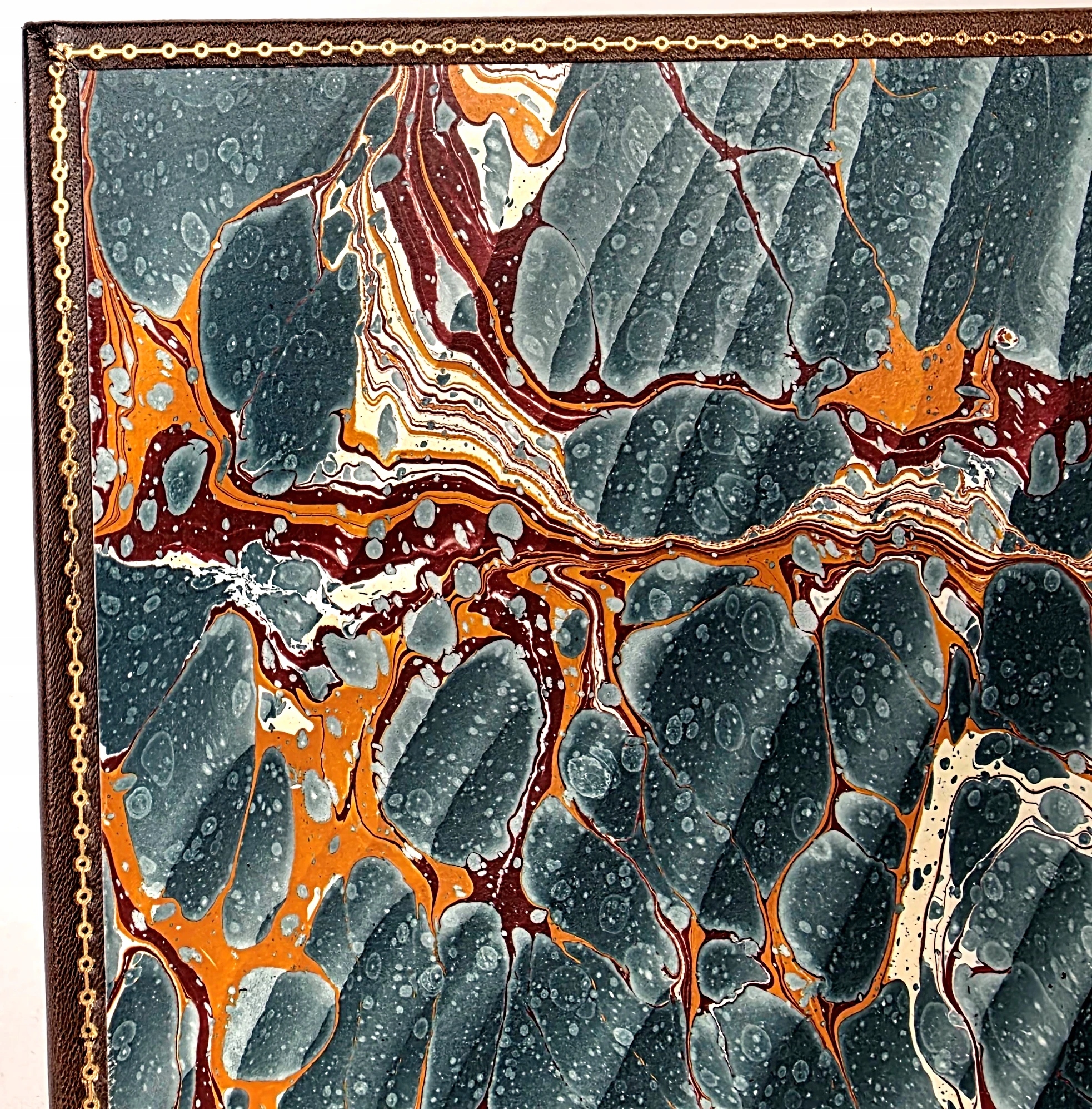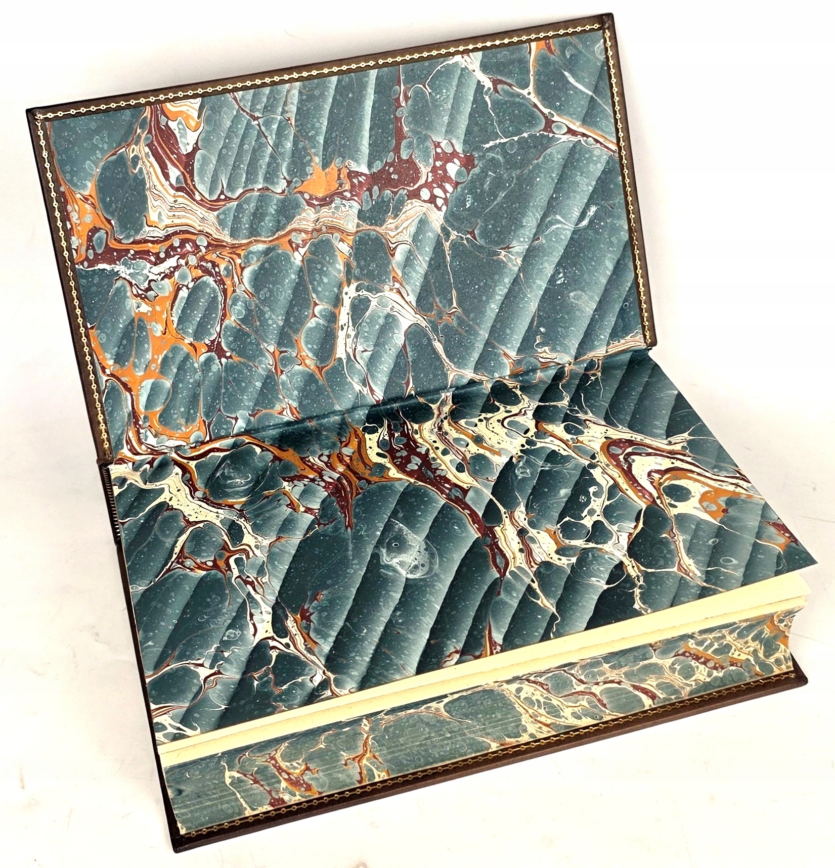 ЦЕЛЕСНОКОЖАНЫЙ ТВЕРДЫЙ ПЕРЕПЕТ, СТОРОНА С ДЕКОРАТИВНЫМ ПОЗОЛОЧЕННЫМ ПОКРЫТИЕМ, ОБЛОЖКИ С ДЕКОРАТИВНЫМИ ПОЗОЛОЧЕННЫМИ КАМНЯМИ С ДЕТАЛЯМИ, РОШЕННЫМИ ВРУЧНУЮ. КОНЦЫ МАРМОРИЗОВАННОЙ БУМАГИ, КАРТОЧНЫЕ КРЕЗКИ, ИЗГОТОВЛЕННЫЕ ПО ОДНОМУ УЗОРУ. ВНУТРЕННЯЯ ЧАСТЬ КРЫШЕК ОТДЕЛЕНА ИНТЕНСИВНЫМ ЗОЛОТЫМ РЕСНЕНИЕМ.