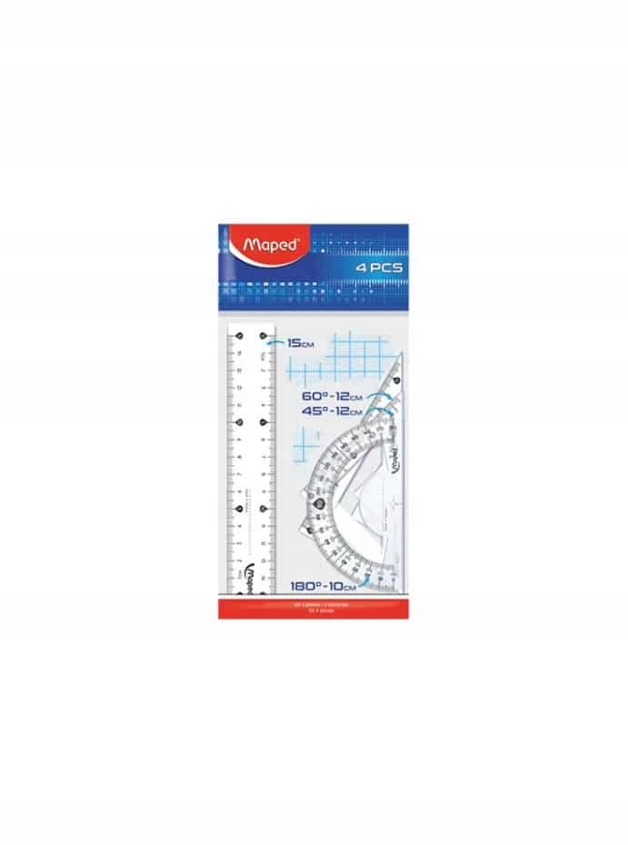 Набор линеек Geometric START, который включает в себя: линейку 15 см, набор угольников 45°–15 см, набор угольников 60° – 15 см, транспортир 180 ° – 10 см. Линейки очень качественные, изготовлены из кристально чистого пластика. Печать на шкале выполнена чернилами, устойчивыми к ультрафиолетовым лучам, что предохраняет от выцветания.