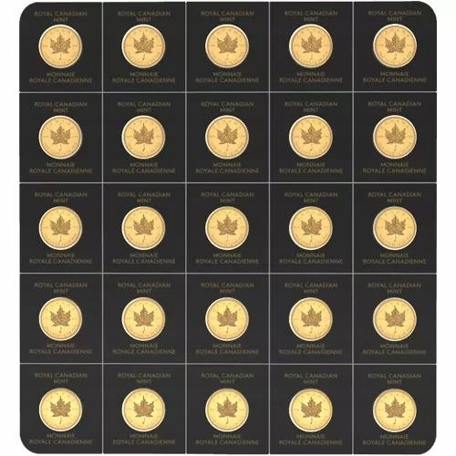 Кленграмма — Золотая монета «Кленовый лист» 25x1 г, отчеканенная Королевским монетным двором Канады. Maplegram — это продукт в коллективной упаковке с миниатюрными монетами, внешне похожими на крупные размеры серии «Канадский кленовый лист».