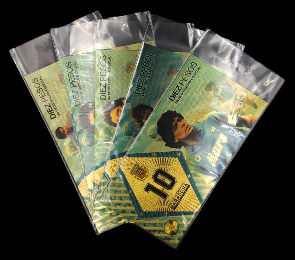 Красивый комплект позолоченных банкнот с изображением Диего Армандо Марадоны и сборной Аргентины.