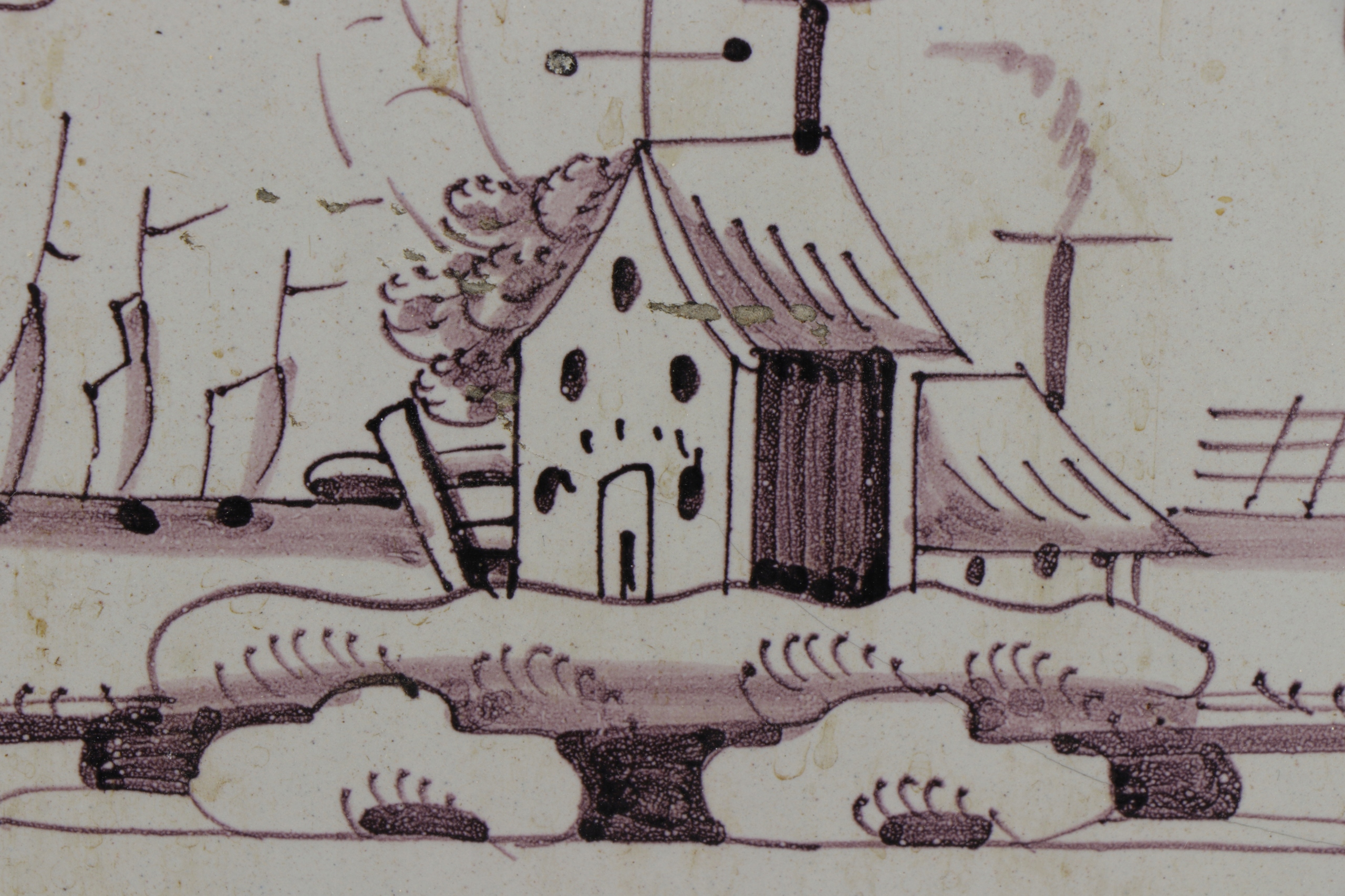Марганцовистая плитка Делфт, расписанная вручную. На плитке изображен орнамент жанровой сцены. Предлагаю другие похожие плитки на другом аукционе.