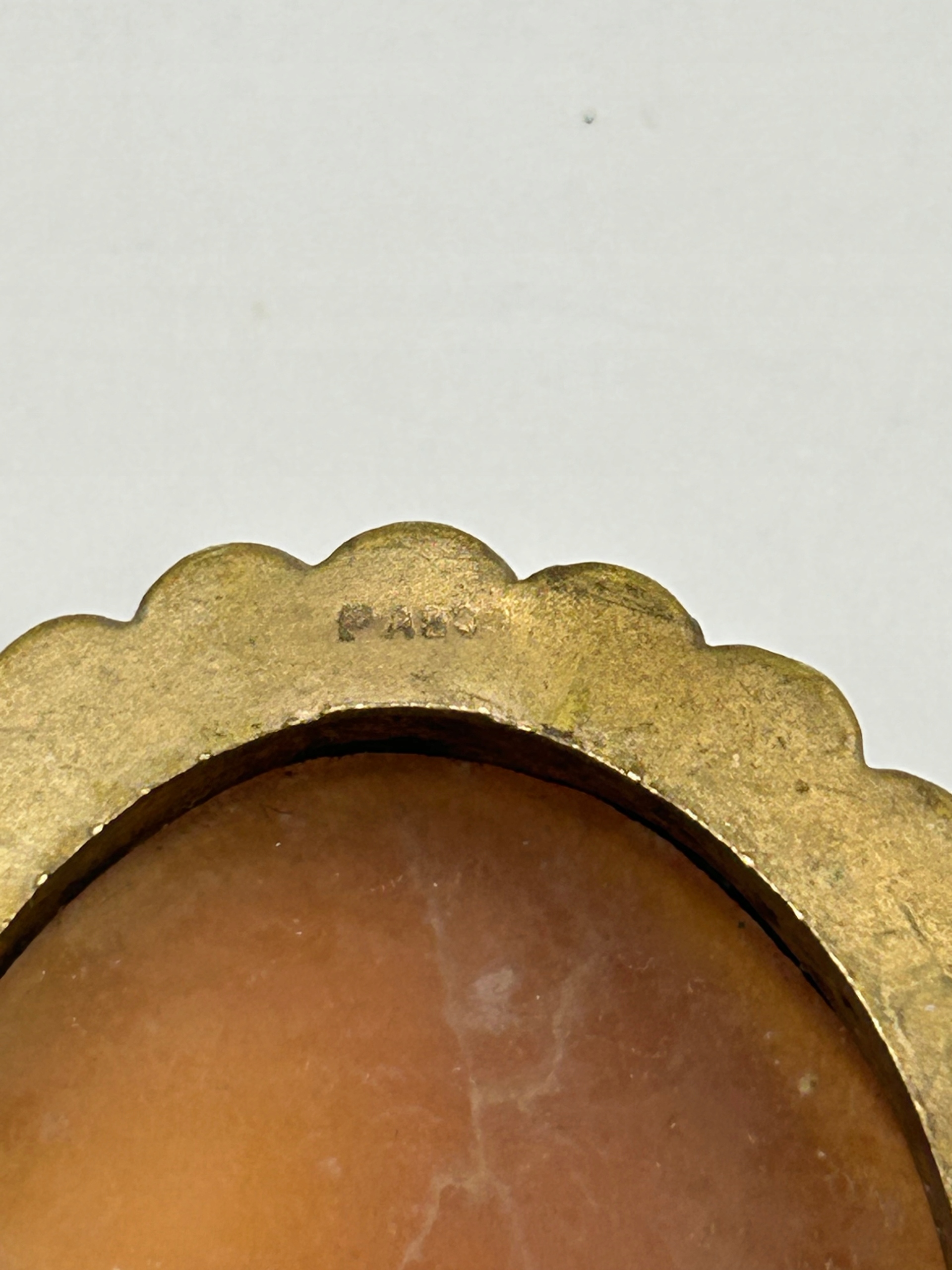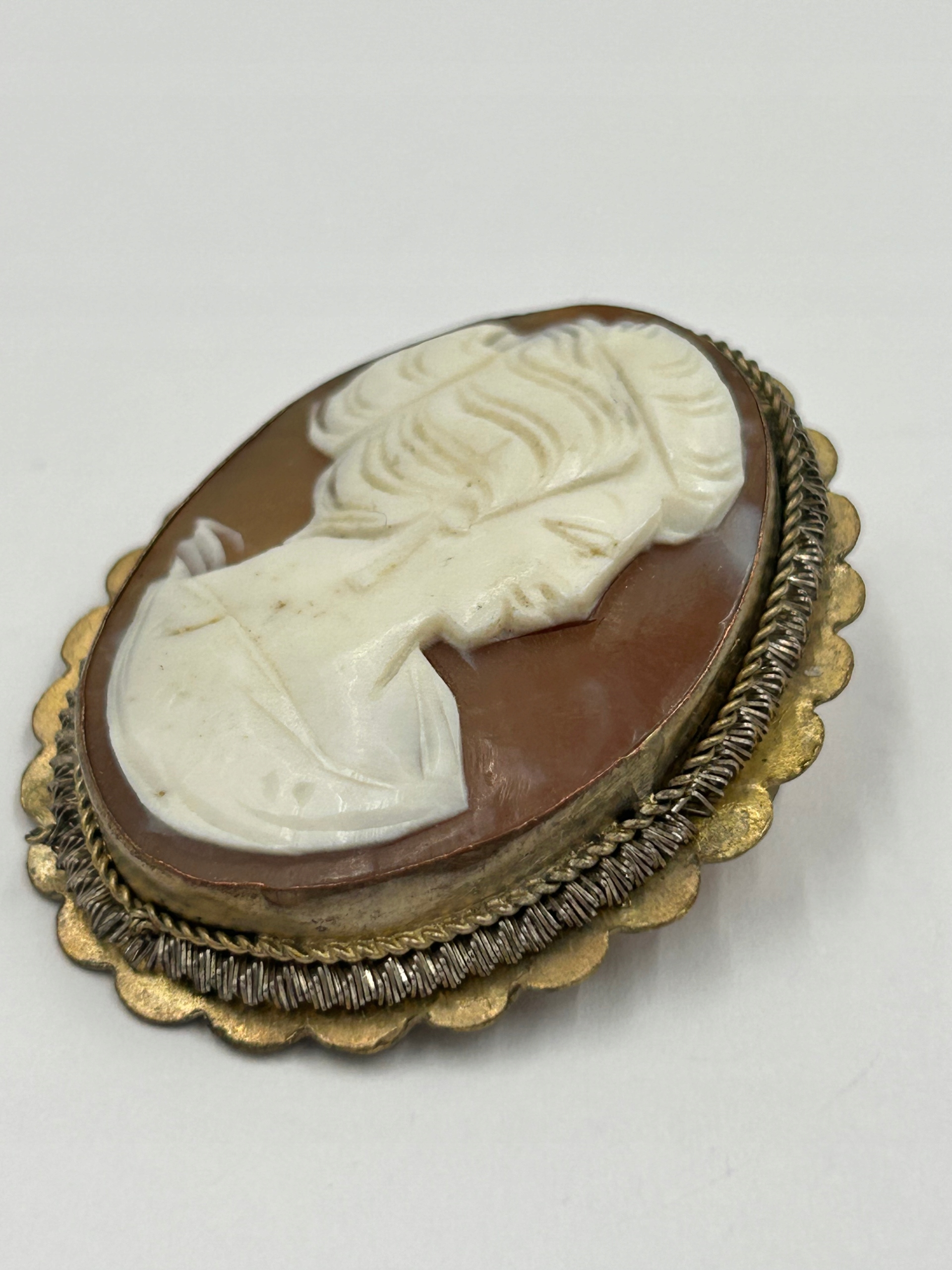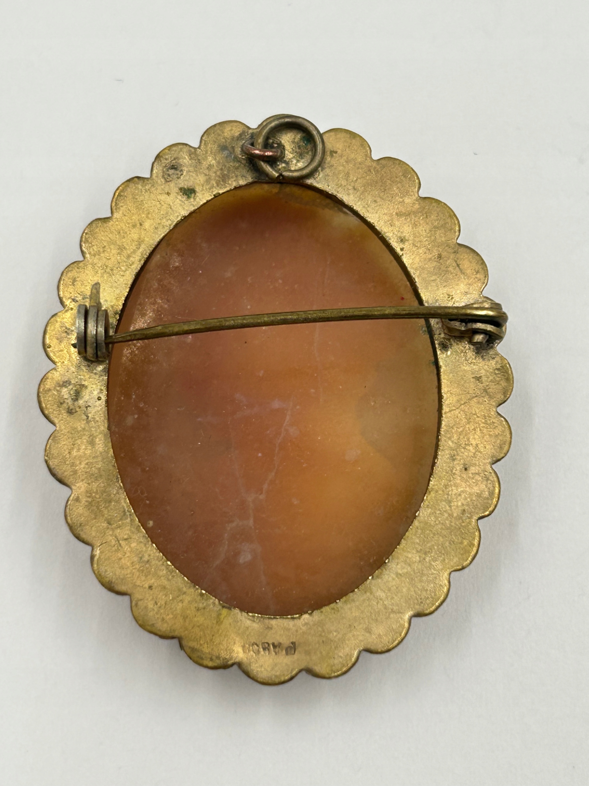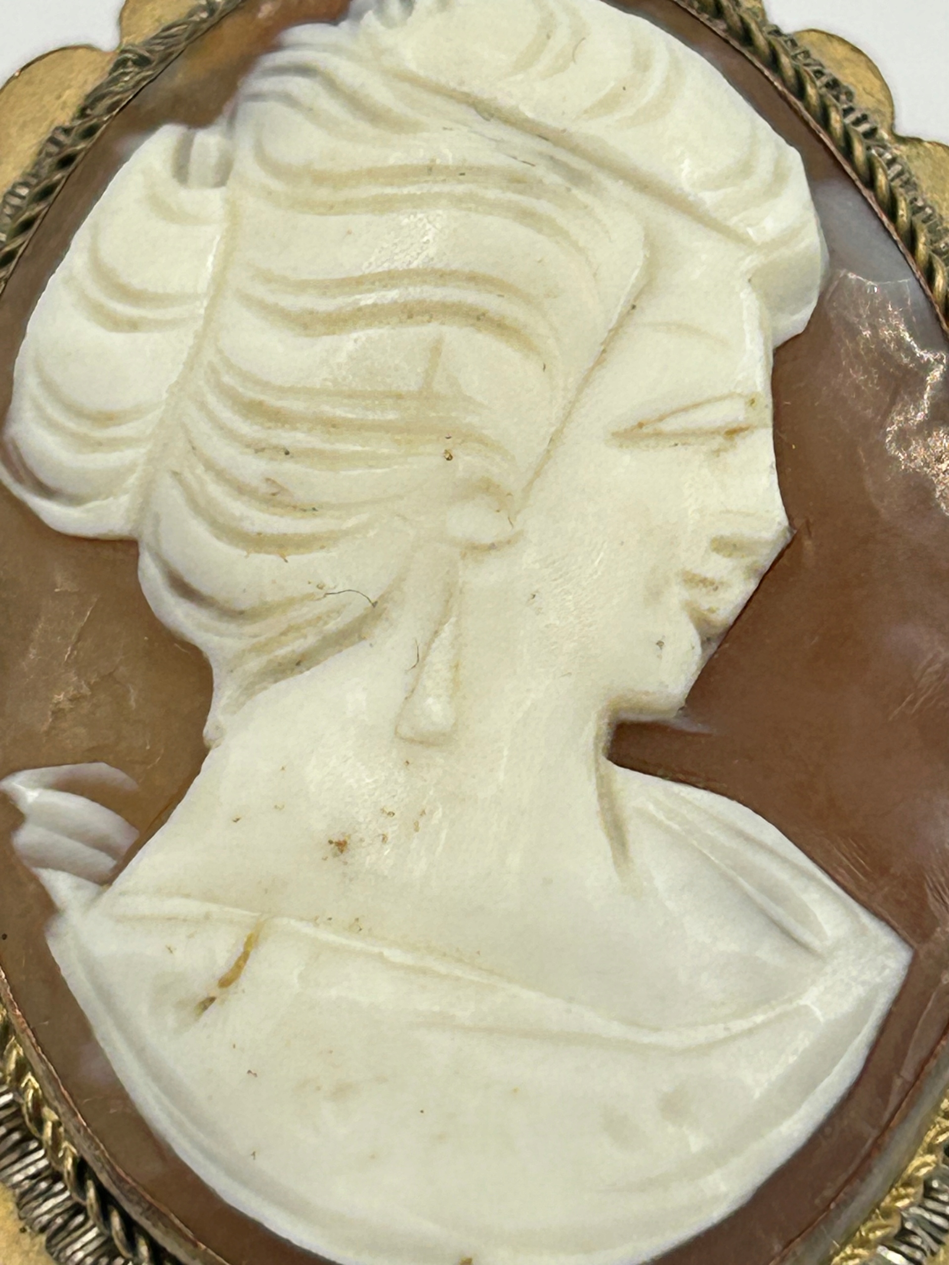 Тема продажи - красивая камея, овальная камеа, вырезанная в раковине, с профилем молодой женщины, декоративным светильником.