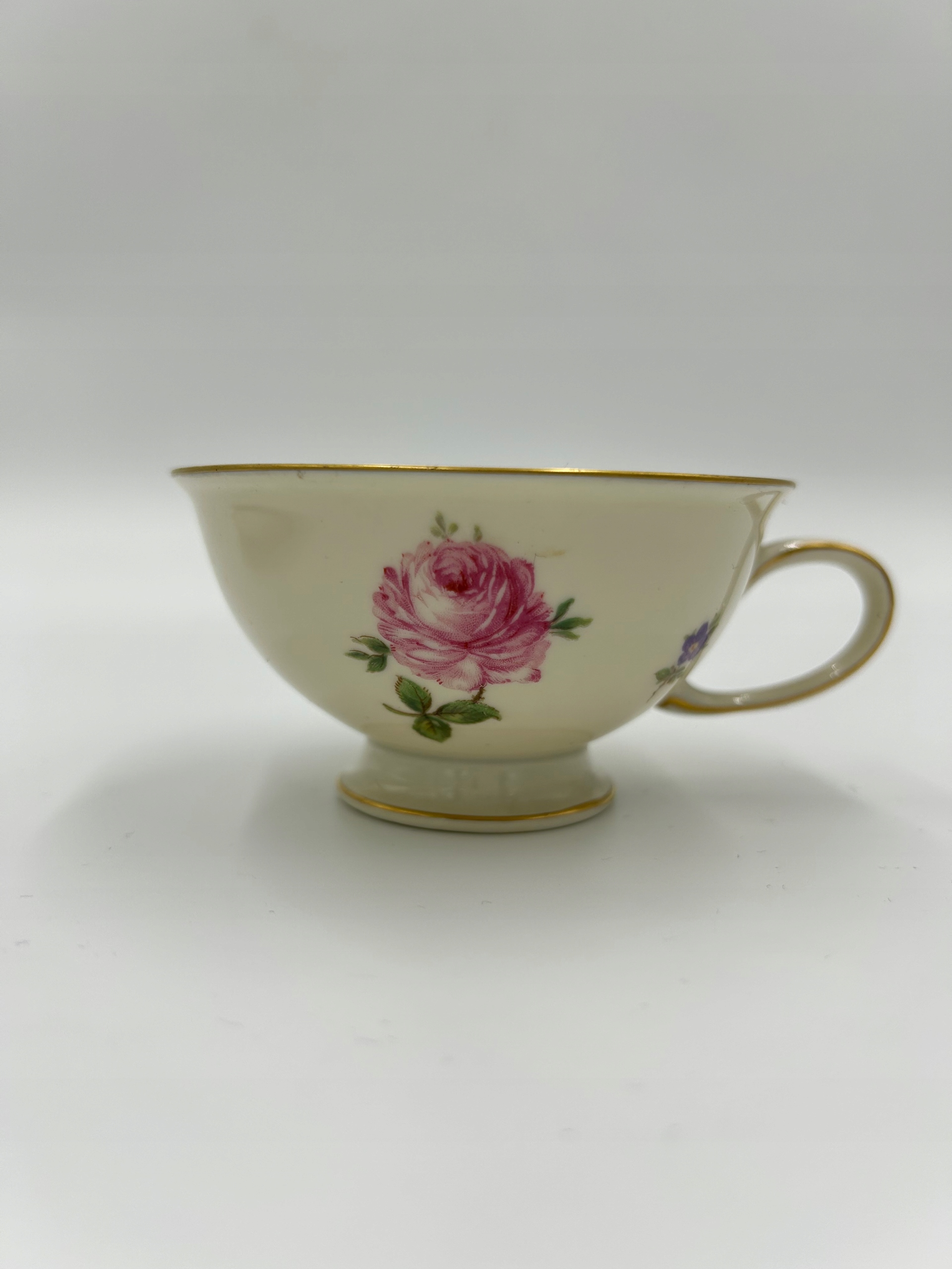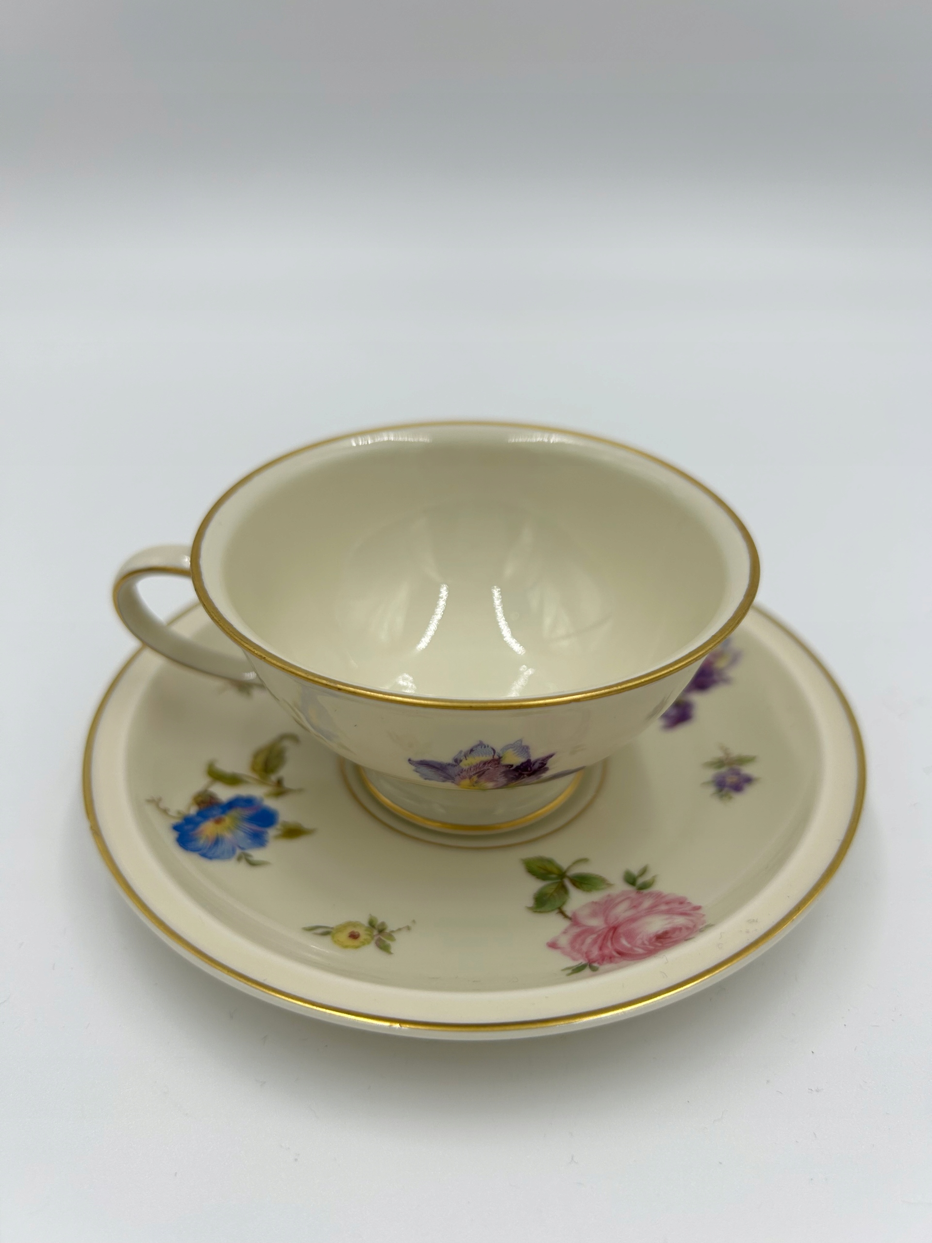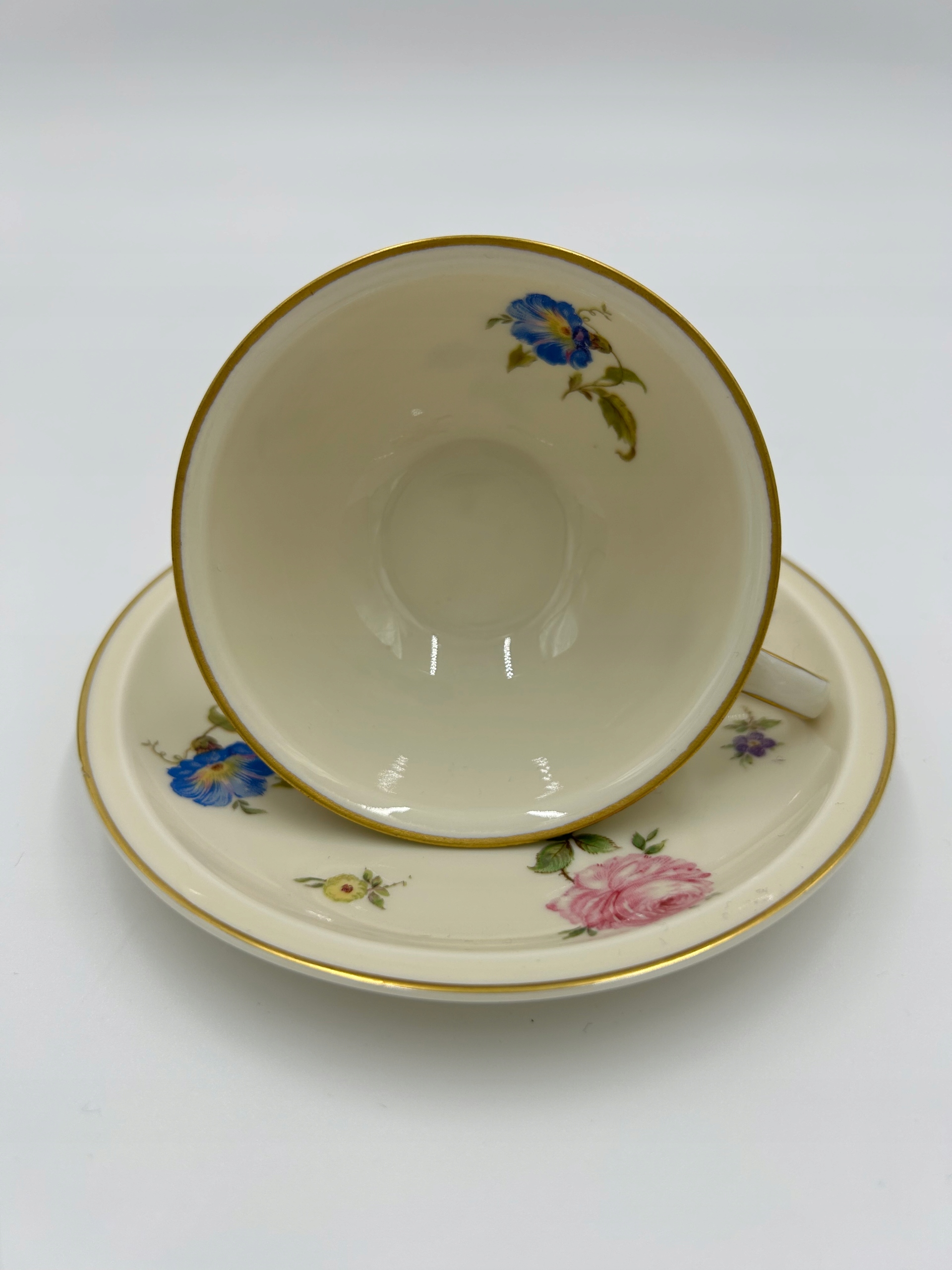 Тема продажи - очаровательный фарфор дуэта, чашка с тарелкой небольшого размера. Изготовлен из фарфора из слоновой кости, украшенный цветочным мотивом, позолоченным краем. очаровательный декоративный объект.