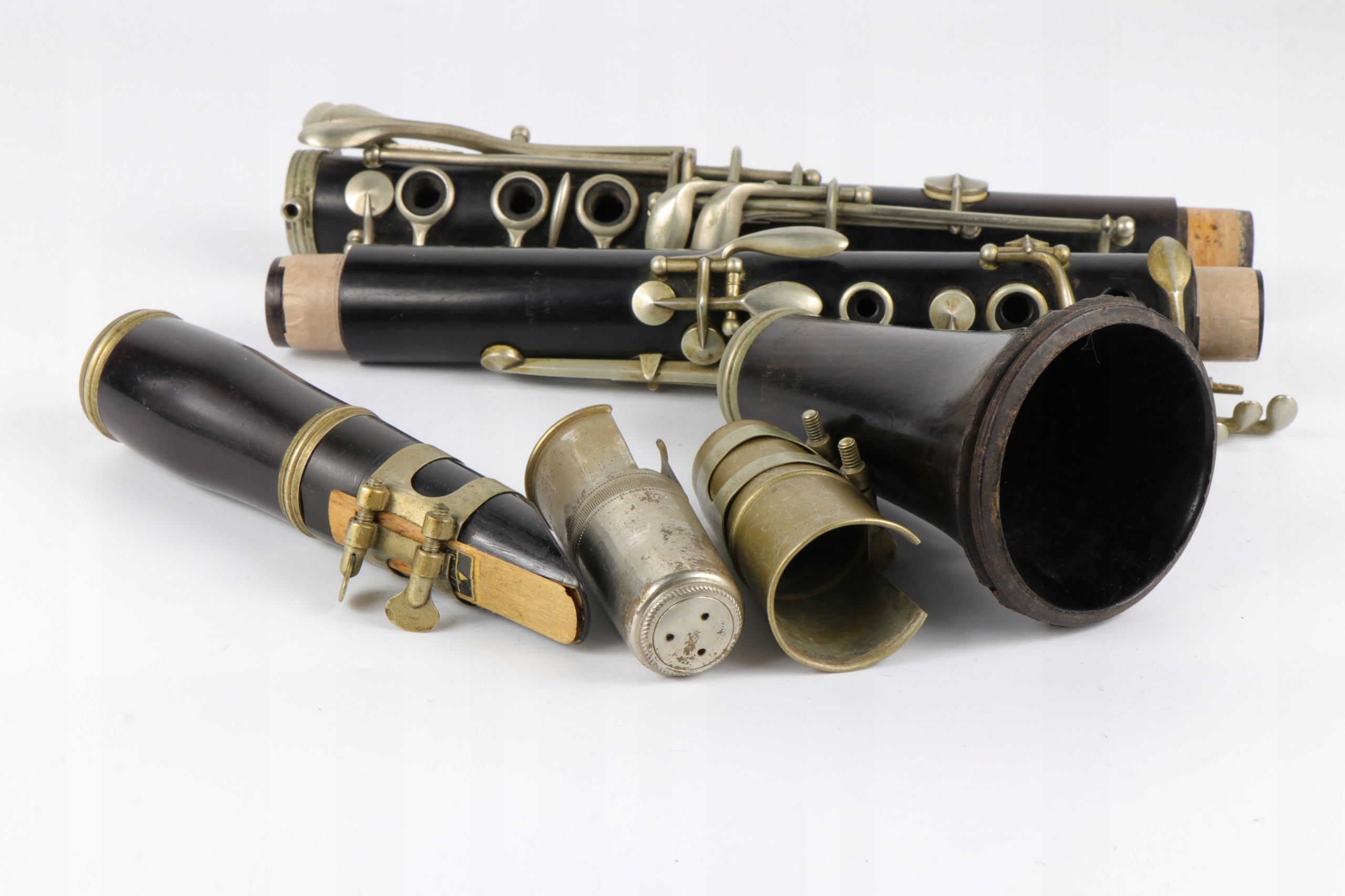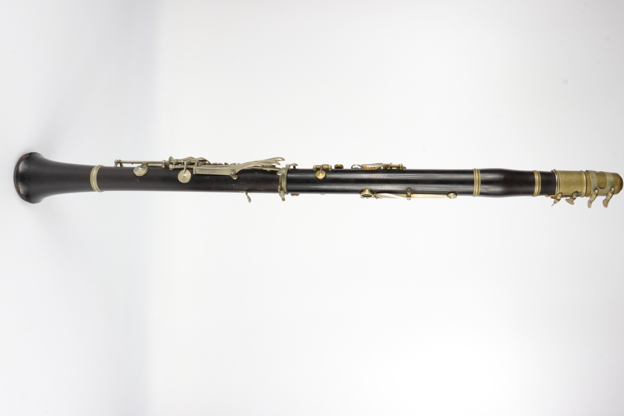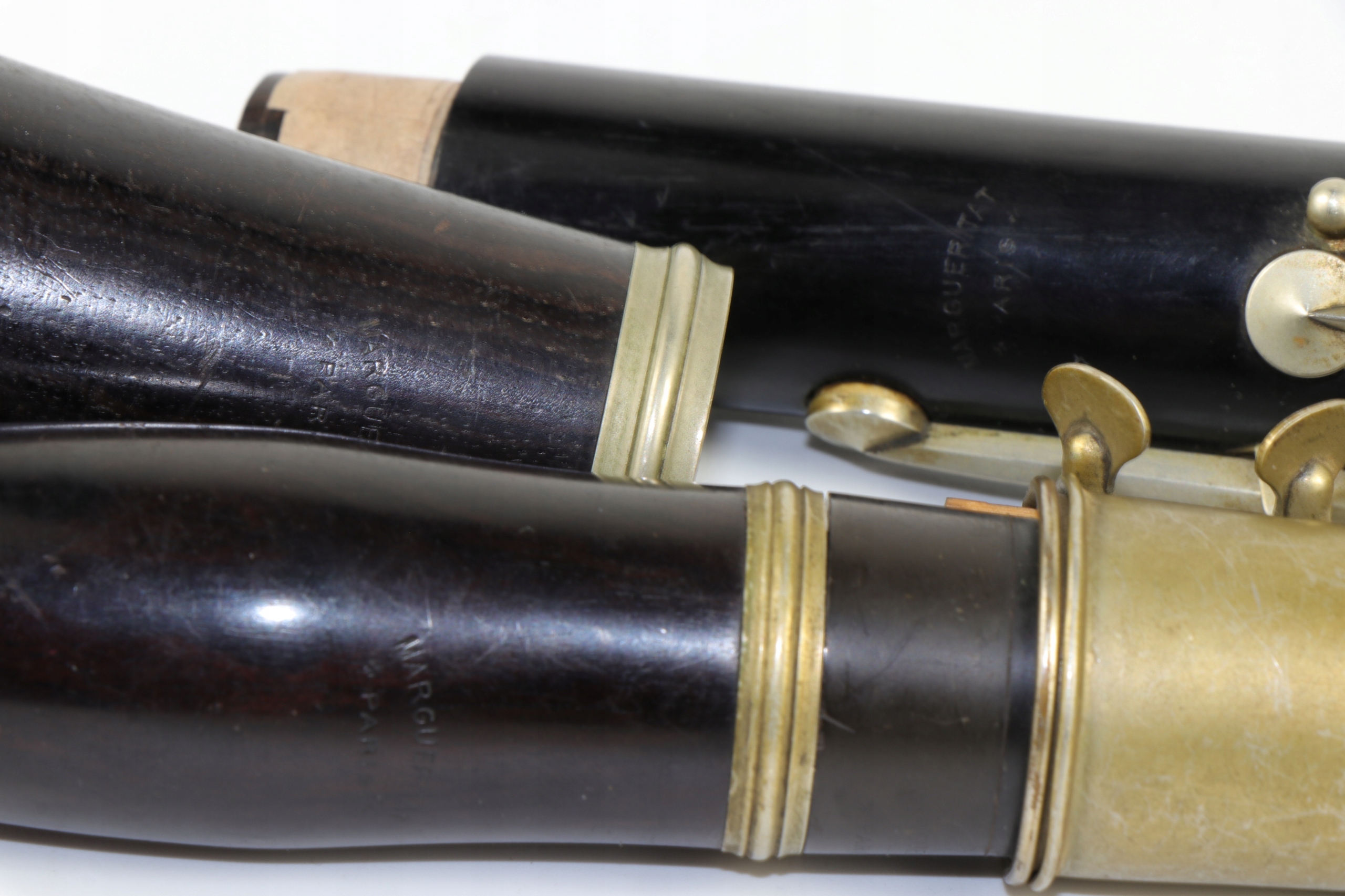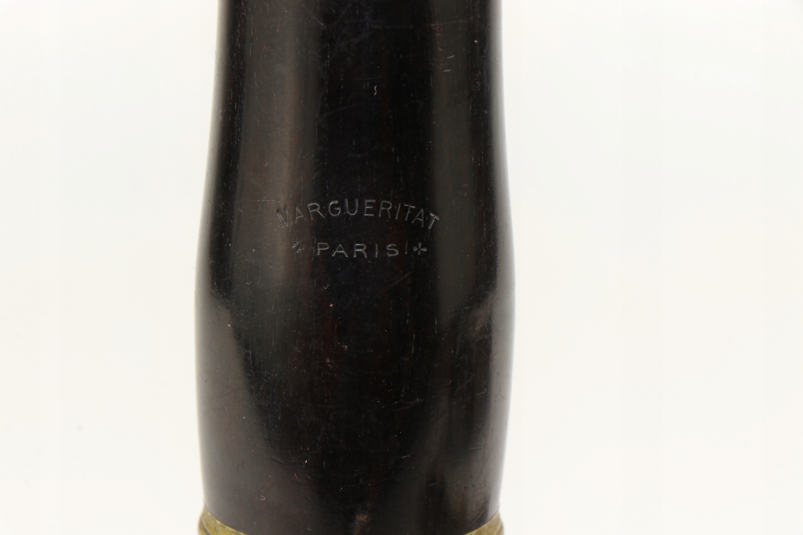 старый исторический кларнет девятнадцатого века, подписанный со знаком Маргеритата Парижа. Компания работала во второй половине 19 -го века. Нижняя часть тела не заряжена.