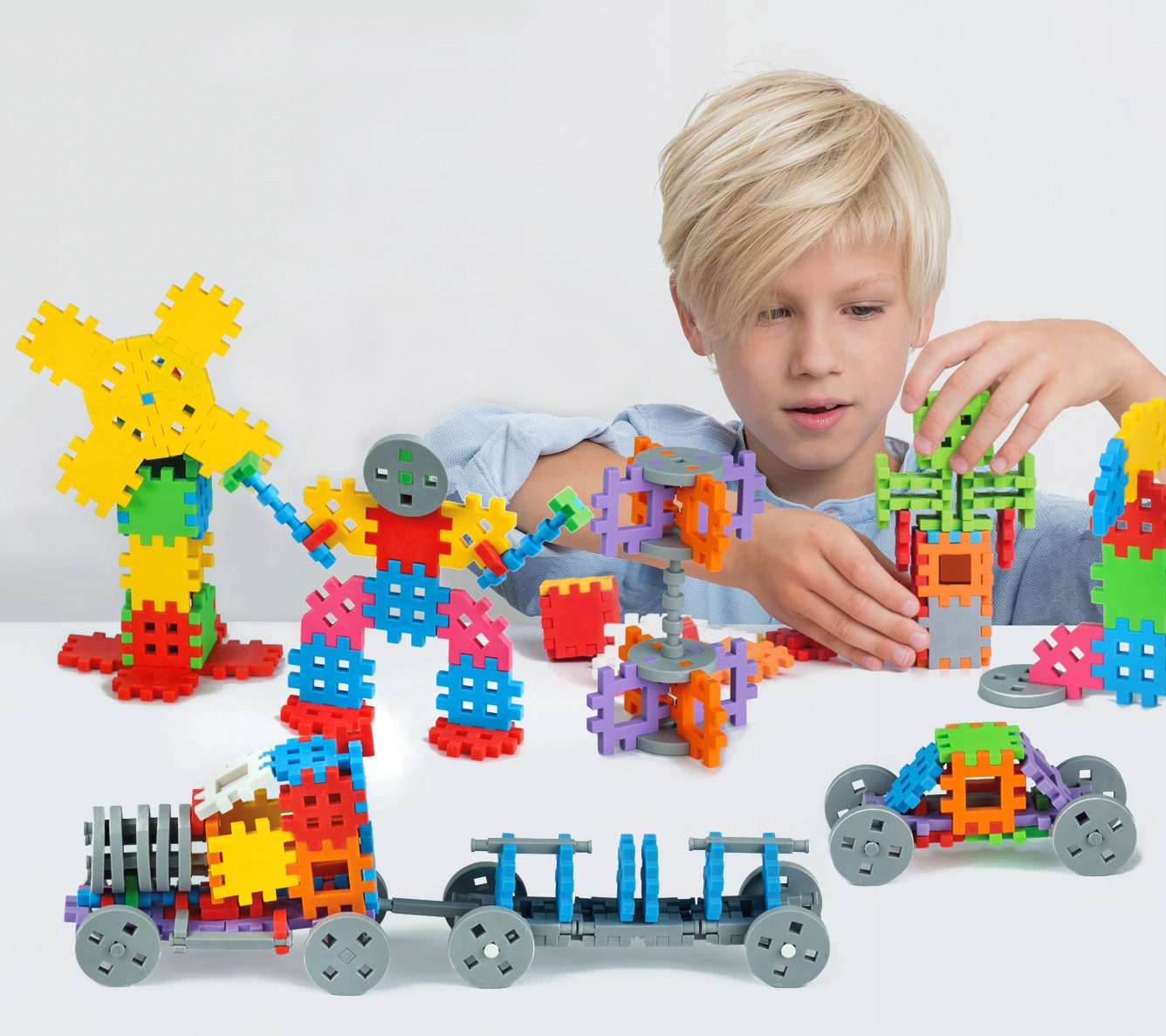 Это набор КОНСТРУКТОР, который можно использовать как независимый набор блоков для создания различных типов зданий или транспортных средств, или как дополнительный набор к традиционным блокам «Вафля» тип доступен в нашем предложении.