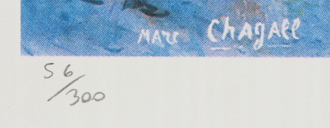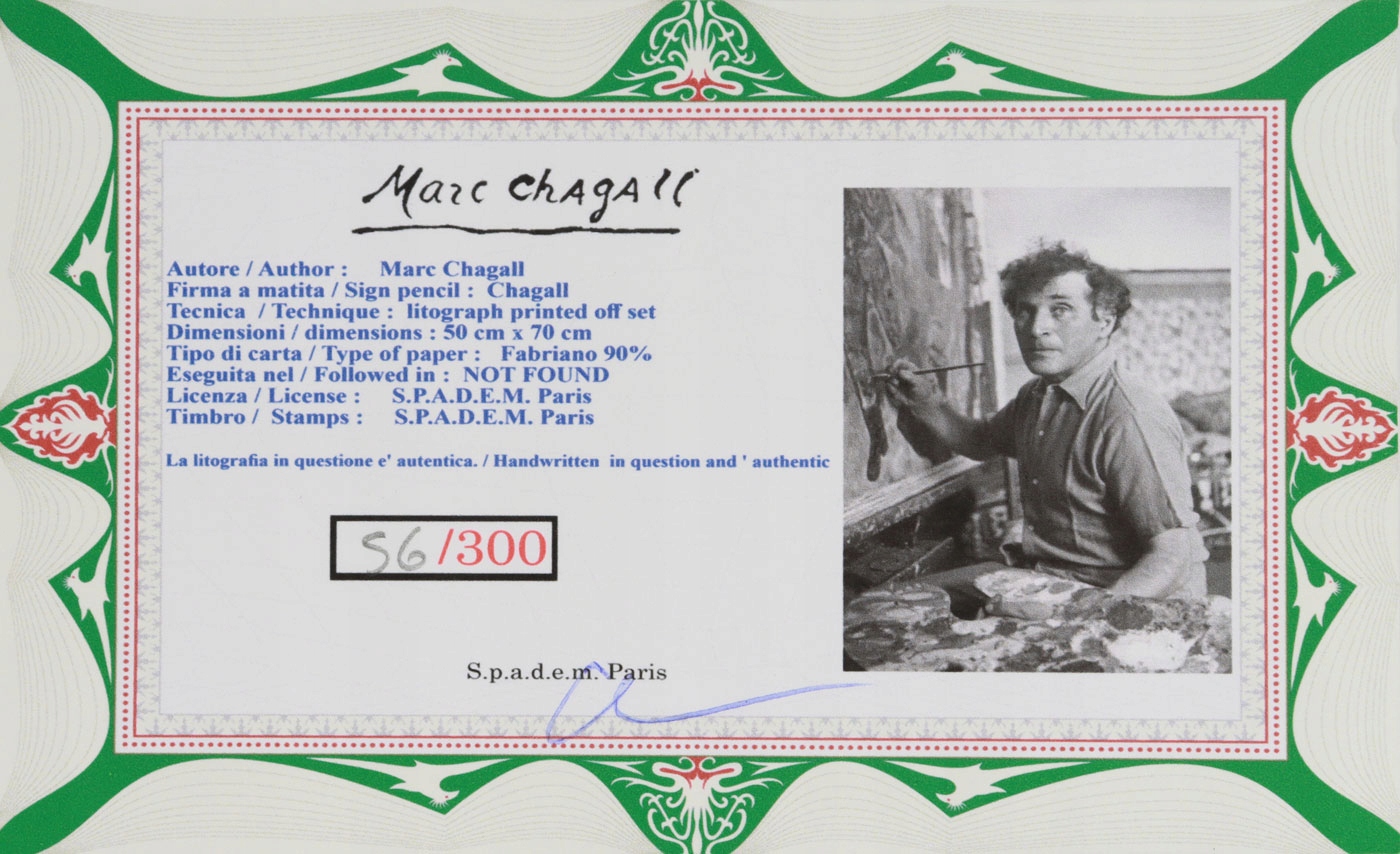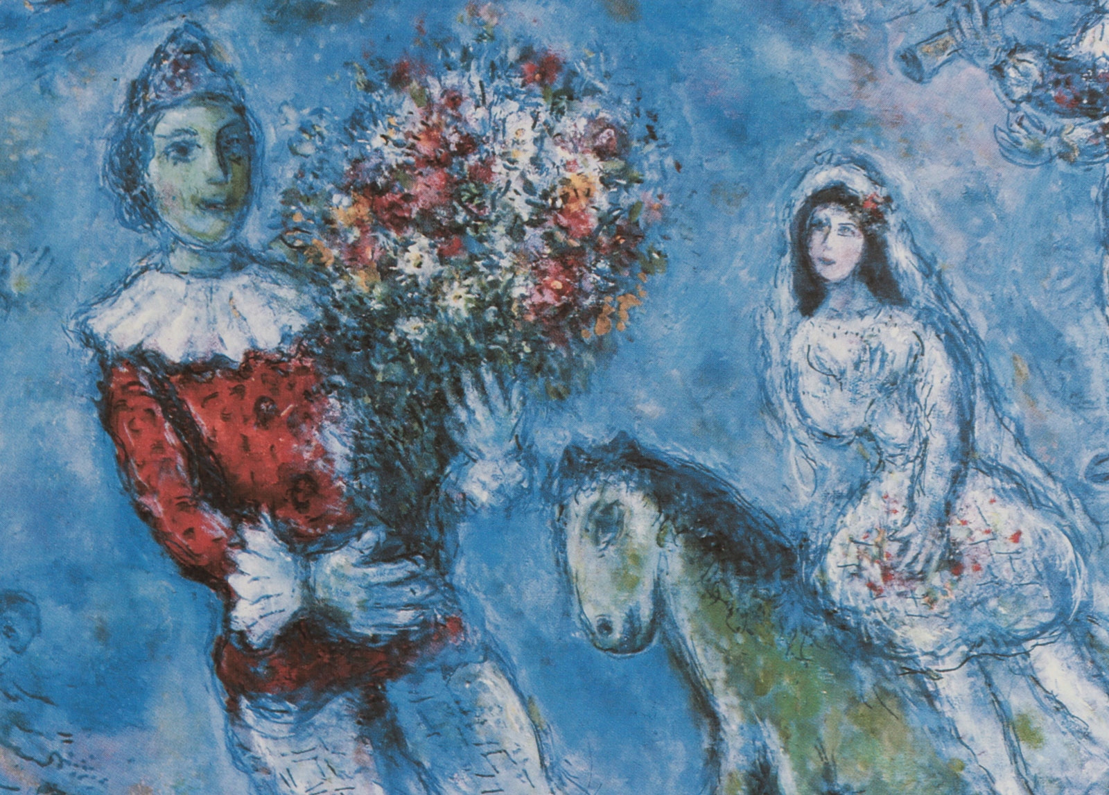 Автор: Марк Шагалл (1887 год, около Витебска-1985 Saint-Paul-de-Vence) Российский художник и графический дизайнер с российским и французским гражданством. Выдающийся представитель Ecole de Paris. Он изучал рисунок с витебийским художником Иуда Пен. В 1907 году он начал учиться в Санкт -Петербургской академии. В 1910-1914 годах он оставался на стипендии в Париже, где наткнулся на кубизм и подружился с Дж. Аполлинаиром и М. Джейкобом. В 1915 году он женился на Белле, которая размышляет о многих своих картинах. В 1919 году он был художественным руководителем государственного еврейского театра в Москве. С 1947 года он жил навсегда в Париже. После наивных и реалистичных изображений в начальном творчестве он уступил влиянию кубизма, экспрессиозма и сюрреализма. В его картинах преобладают веселые любовные темы, пейзажи и религиозные сцены. Характерными средствами экспрессии являются, среди прочего, деформация форм, нарушение пропорции, преимущество живого красного, синего и зелени.