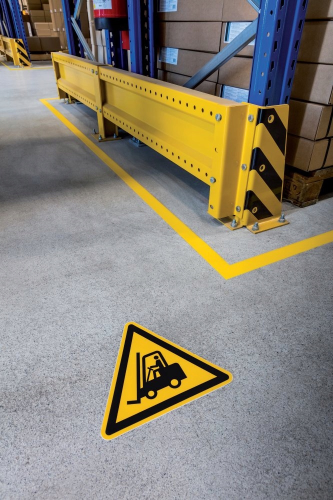 Самоклеящийся треугольный напольный знак безопасности и охраны труда с символом «ВНИМАНИЕ ТРАНСПОРТНЫЕ УСТРОЙСТВА» для обозначения маршрутов сообщения.