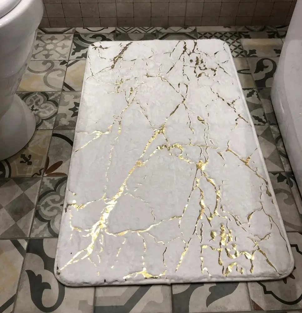 Придайте своей ванной комнате нотку роскоши с помощью нашего элегантного белого ковра с золотистым мраморным узором. Этот прямоугольный ковер сочетает в себе элегантность и функциональность, предлагая не только стильный вид, но также комфорт и безопасность.