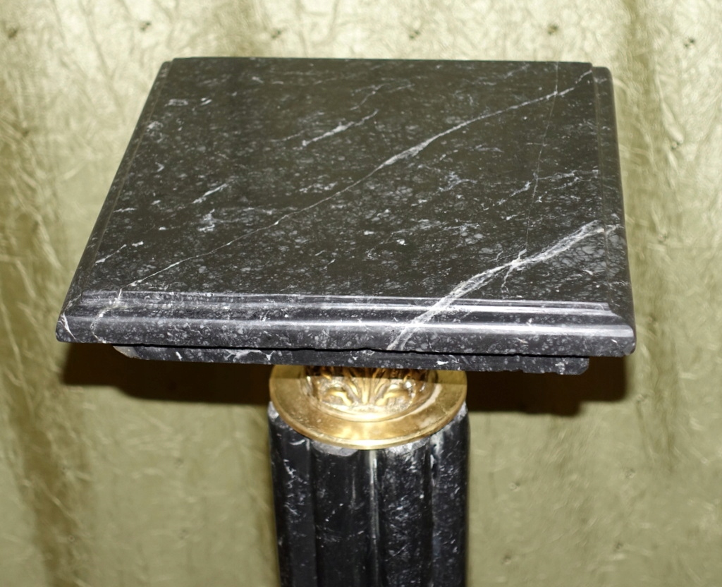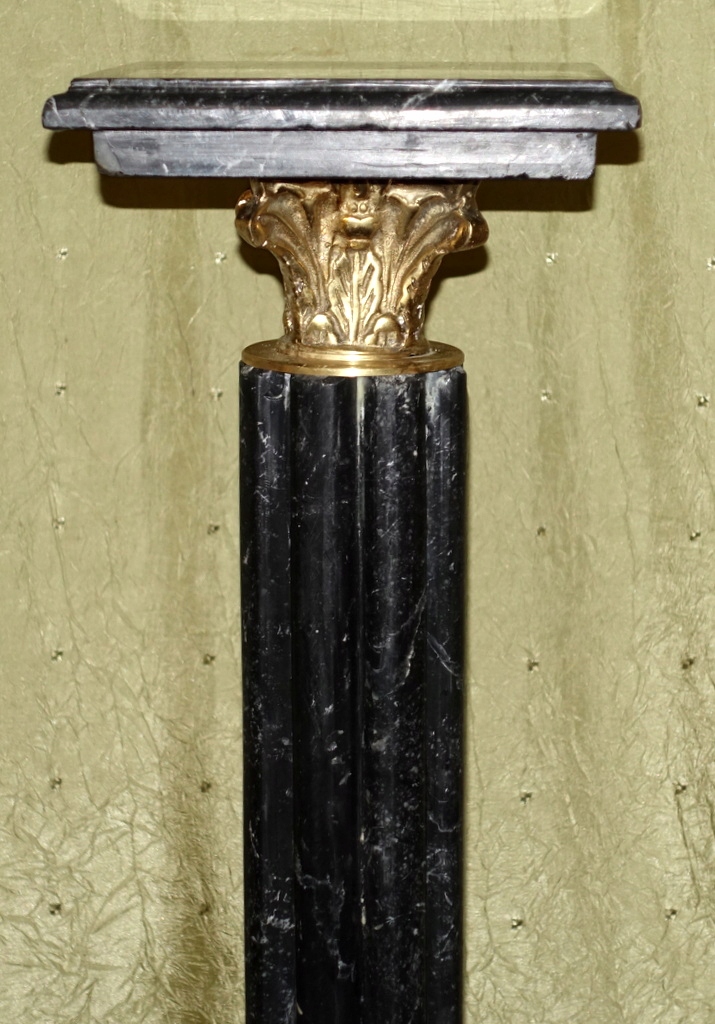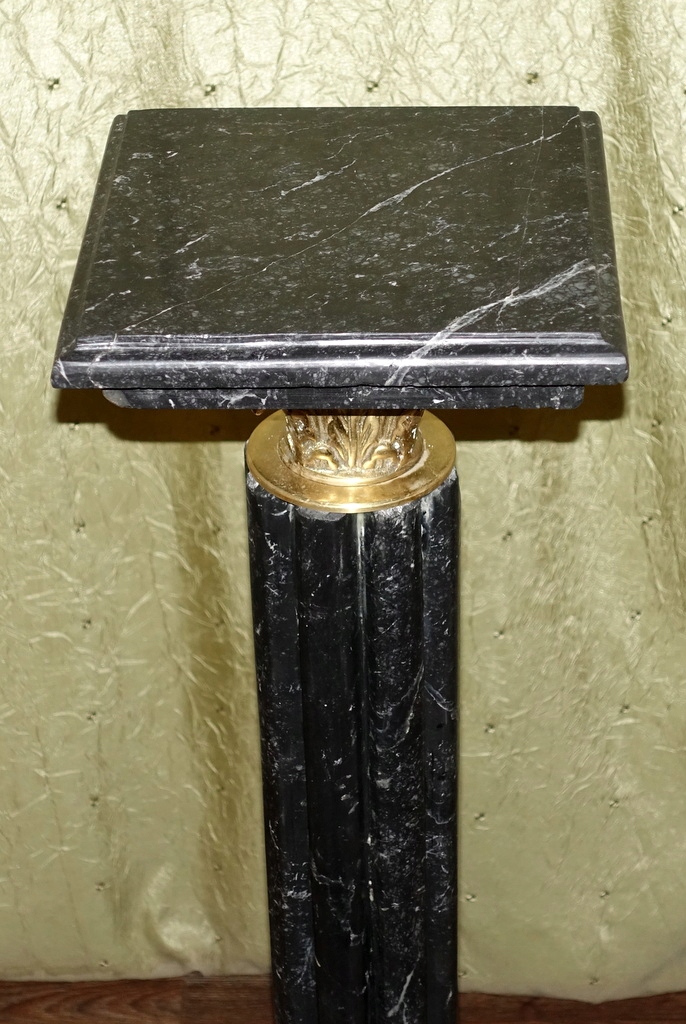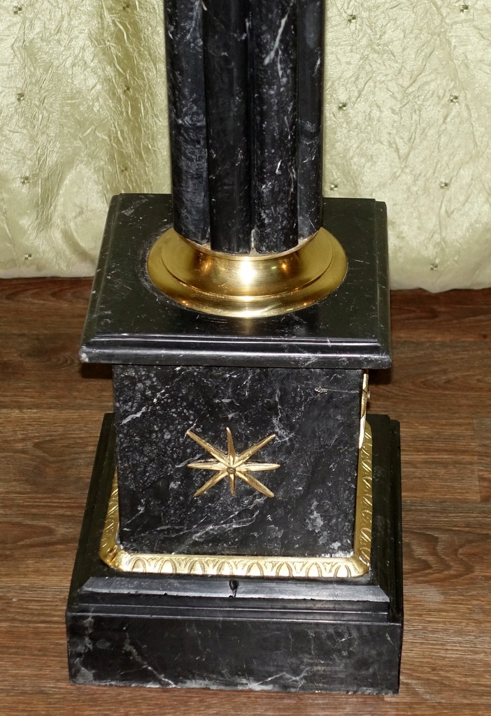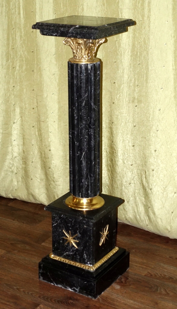 Предметом аукциона является мраморная колонна, выполненная из натурального мрамора черного оттенка, дополнительно украшенная латунными элементами. Смотрится очень красиво и обязательно станет отличным украшением стильного интерьера.