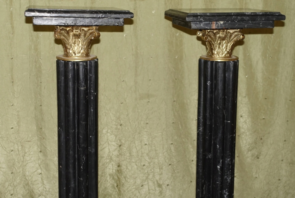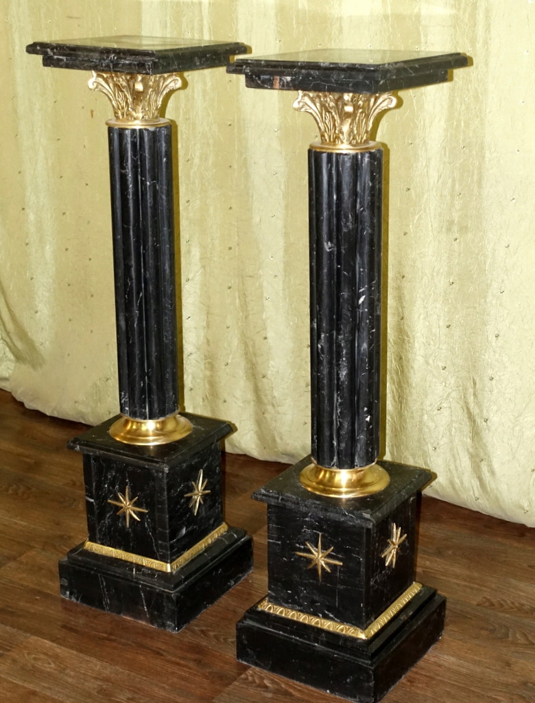 Предметом аукциона являются мраморные колонны, выполненные из натурального черного мрамора, дополнительно украшенные латунными элементами. Они смотрятся очень красиво и обязательно станут отличным украшением стильного интерьера.