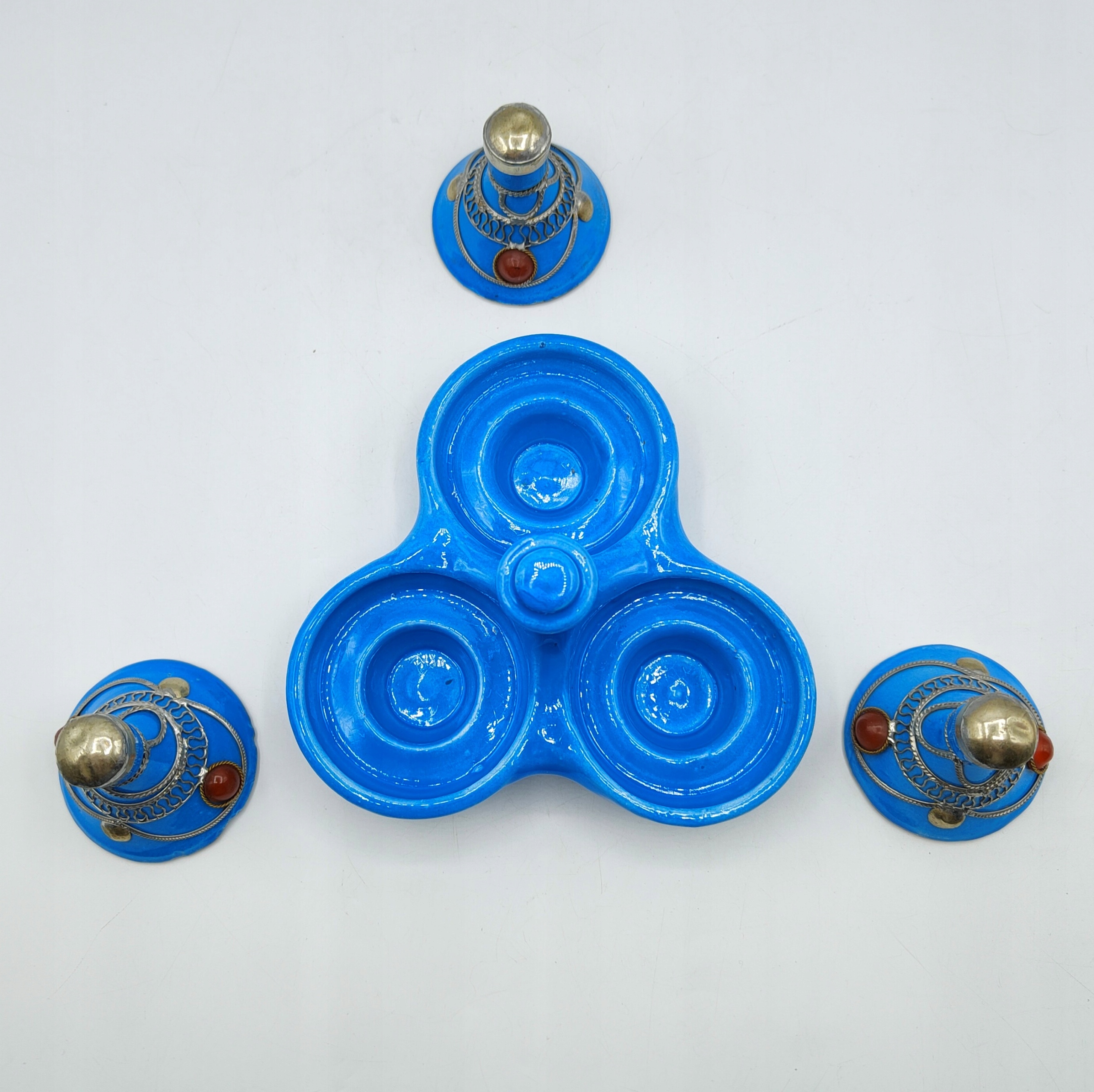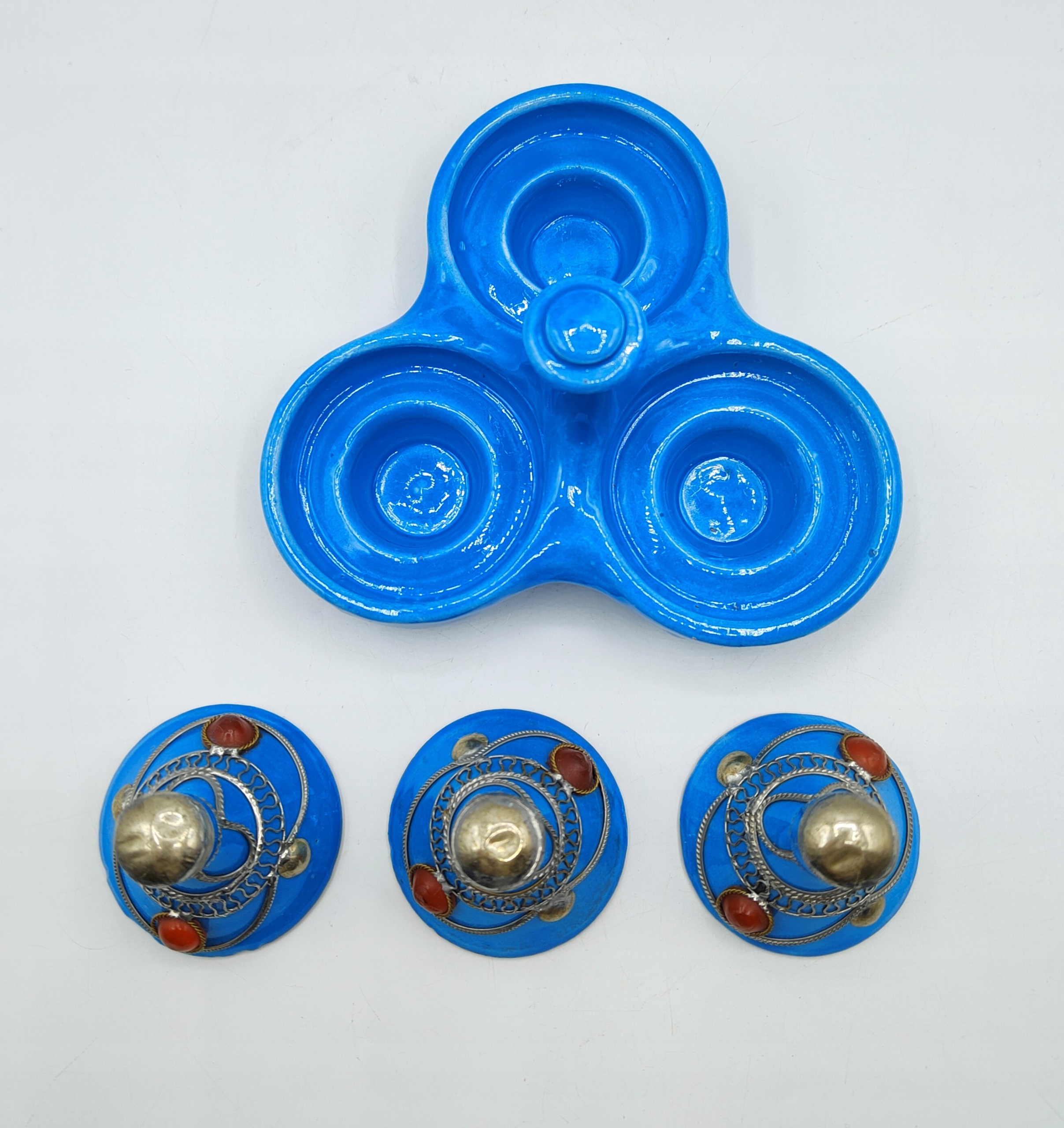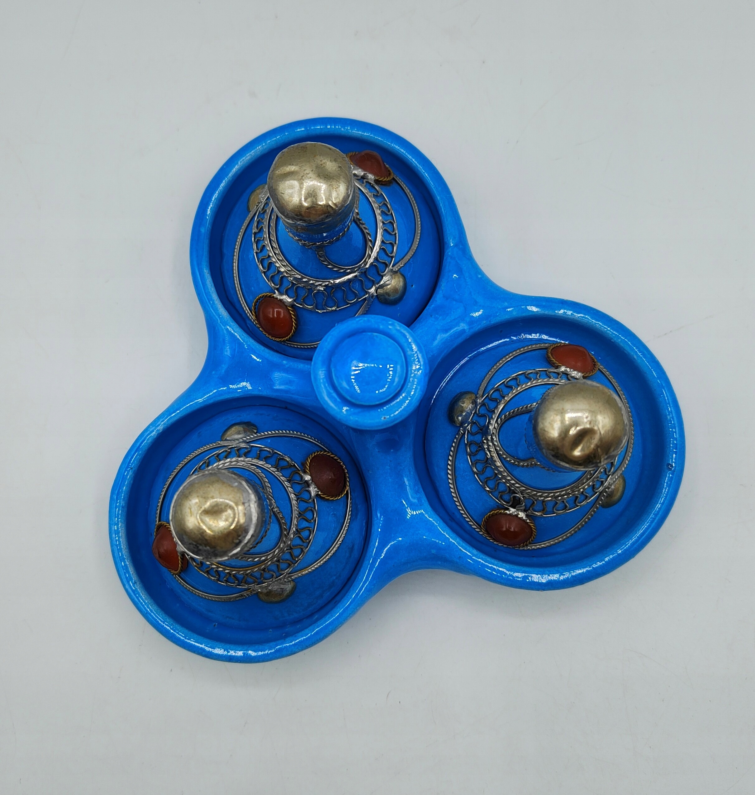 - Винтаж, МАРОККО, "tagine" КРАСИВЫЙ синий тройной контейнер для специй с крышками, кованый ВРУЧНУЮ с использованием нержавеющей стали и декоративных камней!