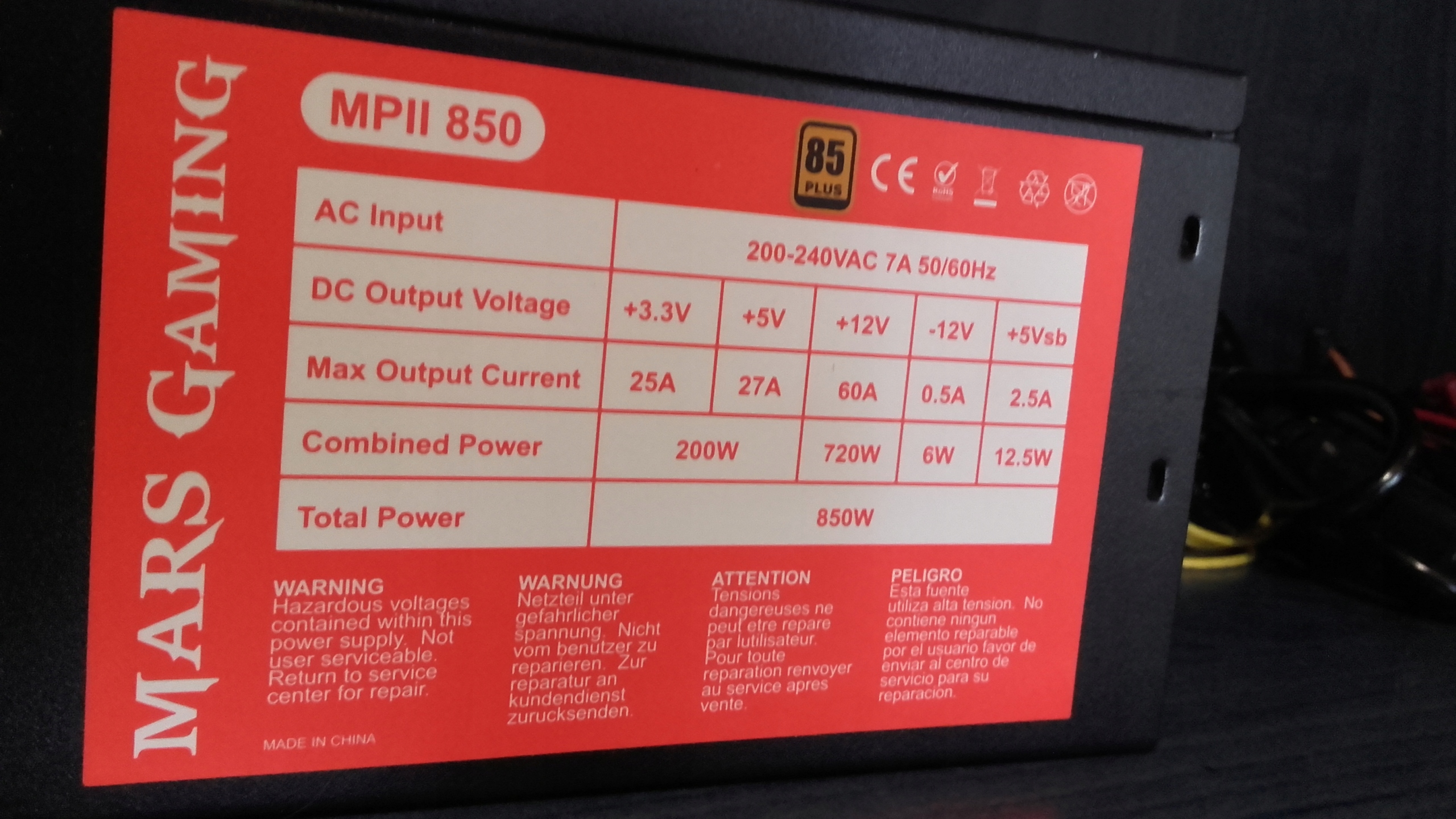 mars gaming mpii850. Всего питания: 850 Вт, входное напряжение переменного тока: 200 - 240 В, входная частота переменного тока: 50 - 60 Гц. Разъем питания материнской платы: 20+4 PIN ATX, Тип проводки: не -Дуда. Цель: ПК, тип источника питания (PSU): ATX, уровень шума: 14 дБ. Цвет продукта: черный, красный, тип охлаждения: активный, диаметр вентилятора: 12 см. Ширина продукта: 150 мм, глубина продукта: 140 мм, высота продукта: 85 мм