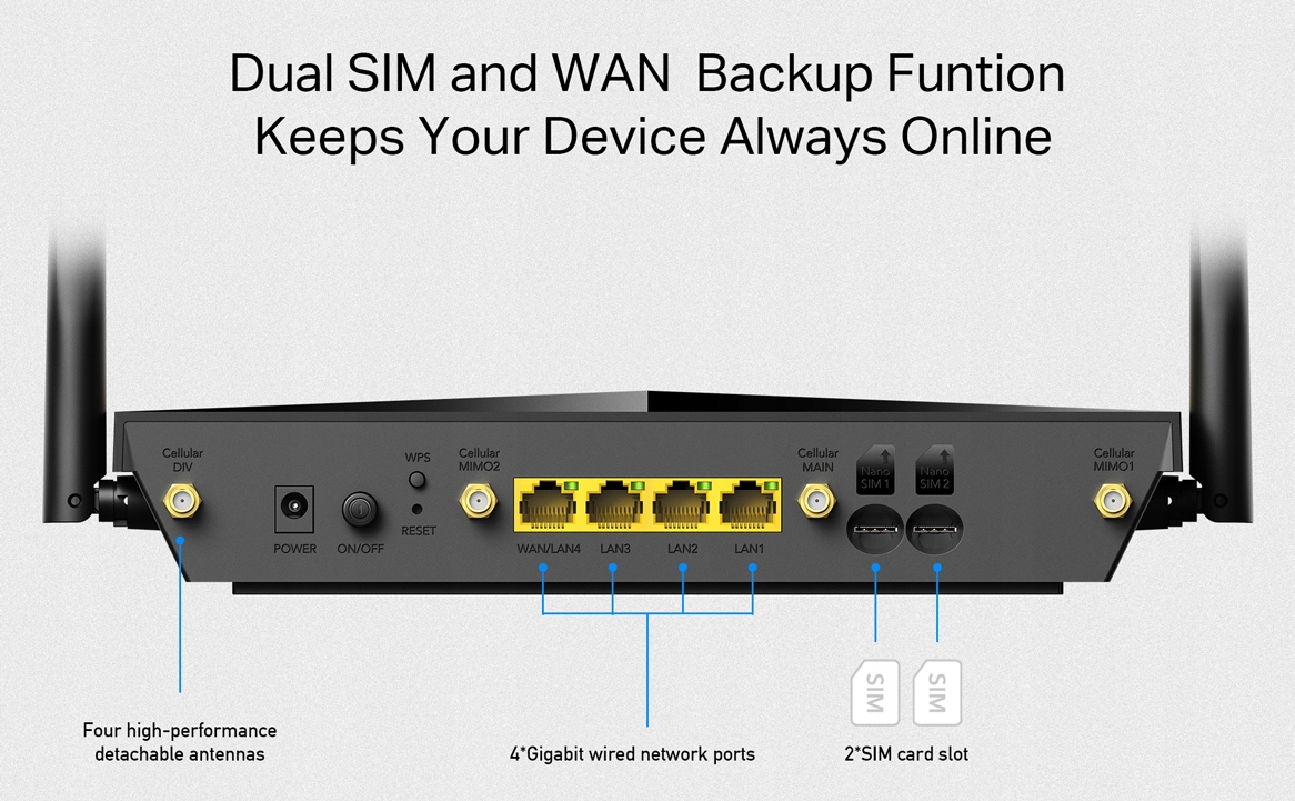 - Порты: 4x GbE RJ45: 1x GbE WAN/LAN, 3x GbE LAN, 2x SIM (nano)