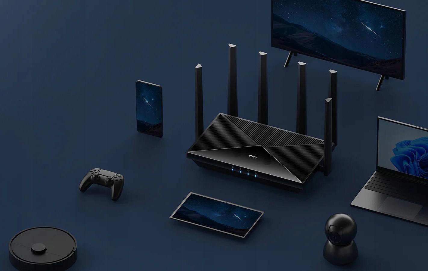 5760MB/ S + 688MB/ S Wi-Fi H2> 4x Gigabit LAN H2> до 200 подключенных комплекса Сетка, VPN -сервер и клиент h2> приложение Cudy, Cloud Control H2>