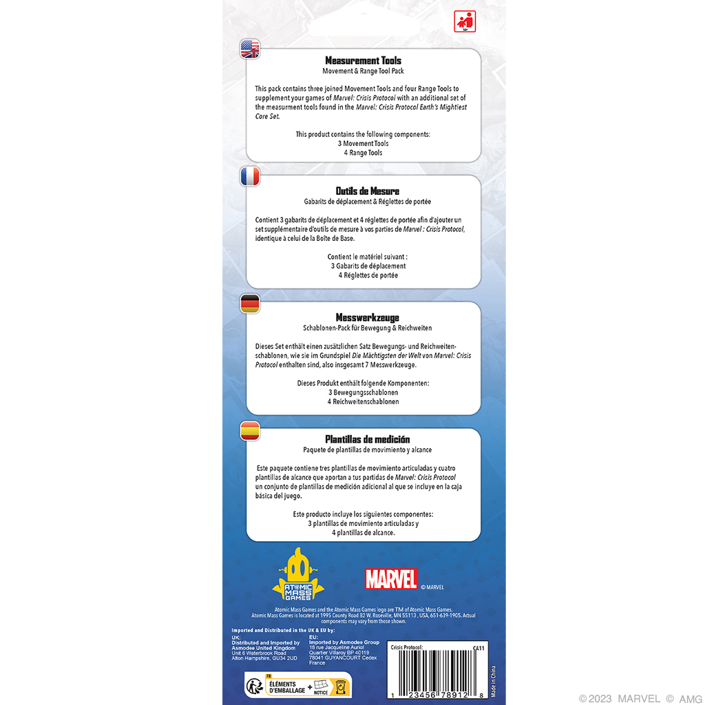 "Игроки возвращаются в Marvel: Crisis Protocol с обновленными инструментами измерения, содержащимися в этом пакете! Этот пакет, включающий дополнительные 4 инструмента измерения диапазона и 3 инструмента перемещения, заменяет измерительные инструменты из пакета инструментов движения и диапазона CP03 на обновленные инструменты, которые также входят в пересмотренный базовый набор Crisis Protocol, чтобы гарантировать игрокам все необходимое для точных измерений и перемещений."