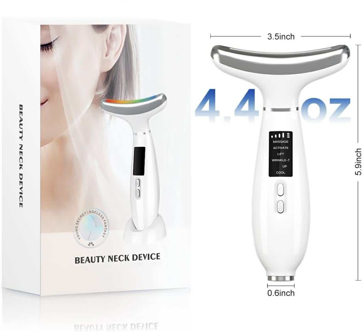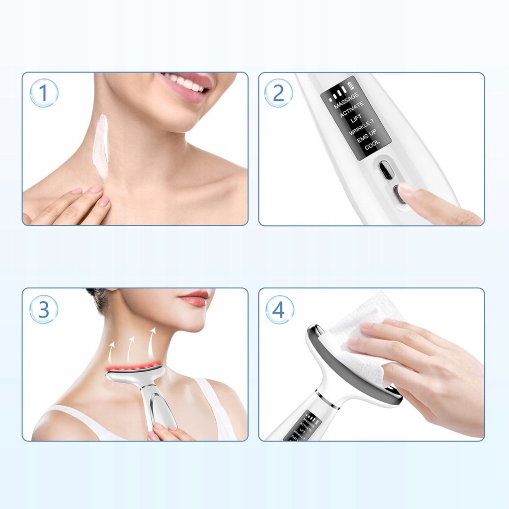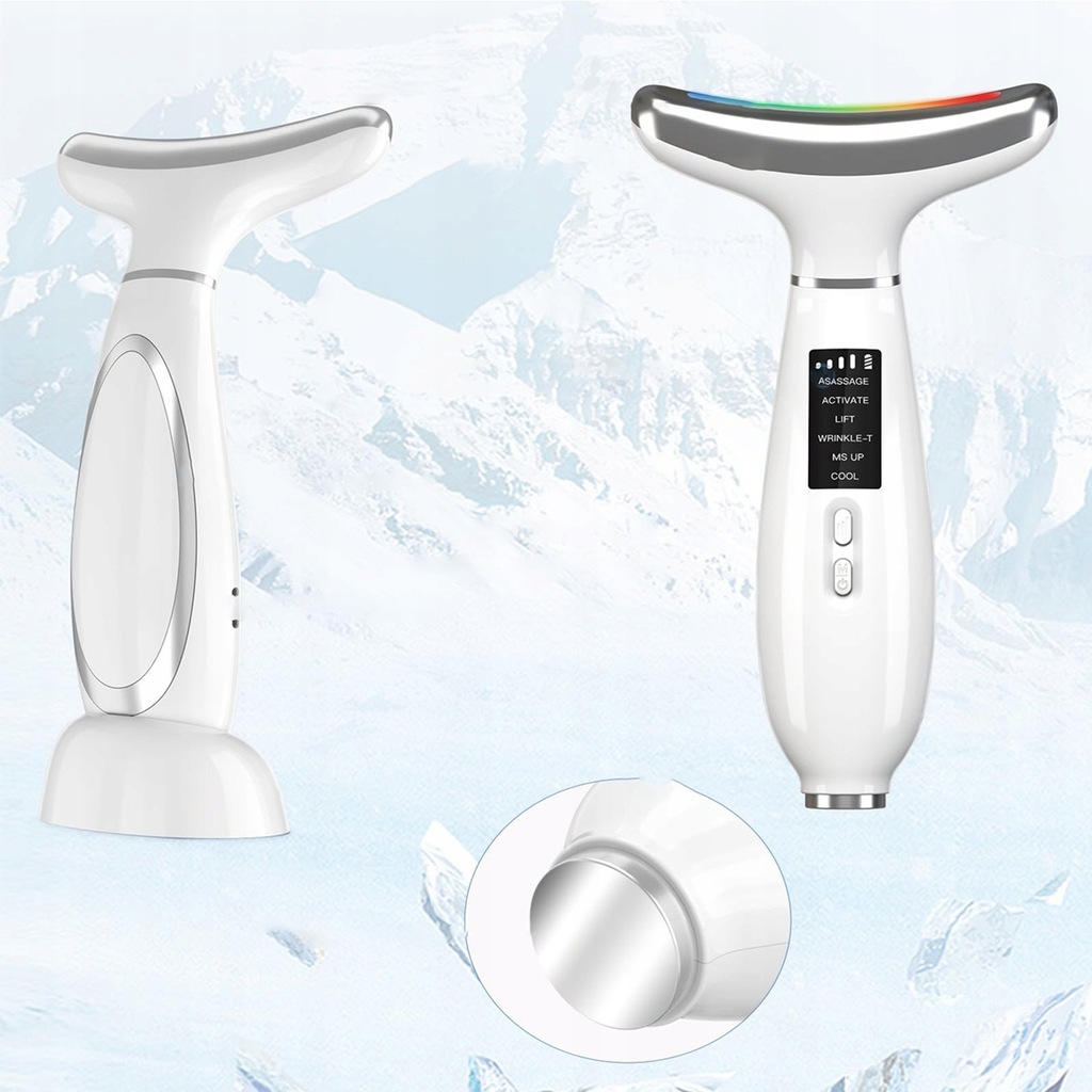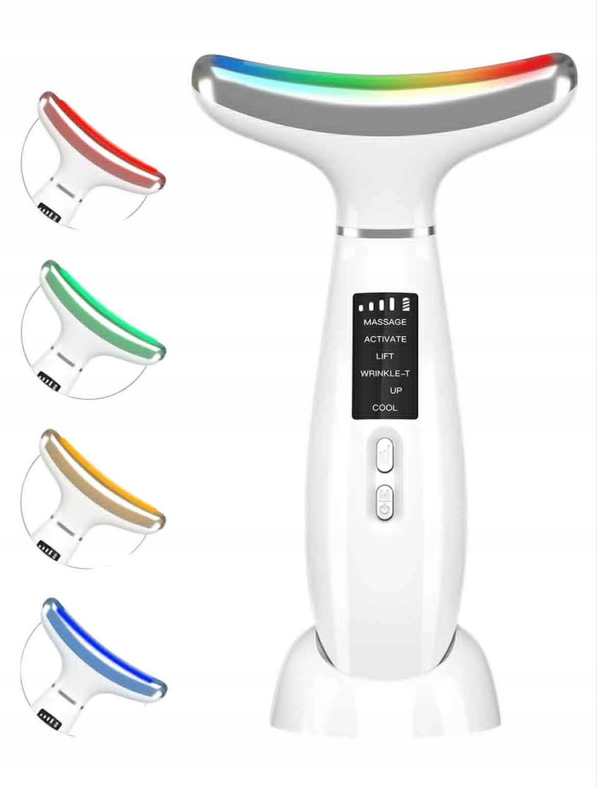 Устройство массажа лица и шеи: 4-цветовое устройство для лица заботится о коже в зависимости от длины волн света. Режим красного света уменьшает небольшие линии и пигментацию; Режим зеленого света улучшает микроциркуляцию кожи и успокаивает отек; Режим оранжевого света увеличивает сопротивление кожи и ремонтирует повреждение. Синий световой режим регулирует секрецию нефти и борется с провисанием кожи.