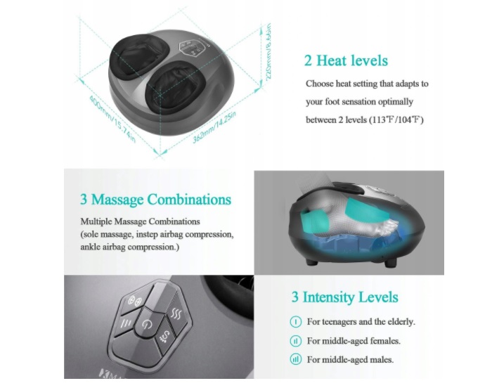 - Всеми функциями массажа (роллинговый массаж, функция сжатия воздуха и нагрева) этого электрического массажера для ног можно управлять независимо, что обеспечивает более гибкие комбинации массажа. Этот разминающий массажер для ног эргономичен, чтобы удобно обнимать ваши ноги и подходит для стоп размером до 12,5 США для различных форм стоп.