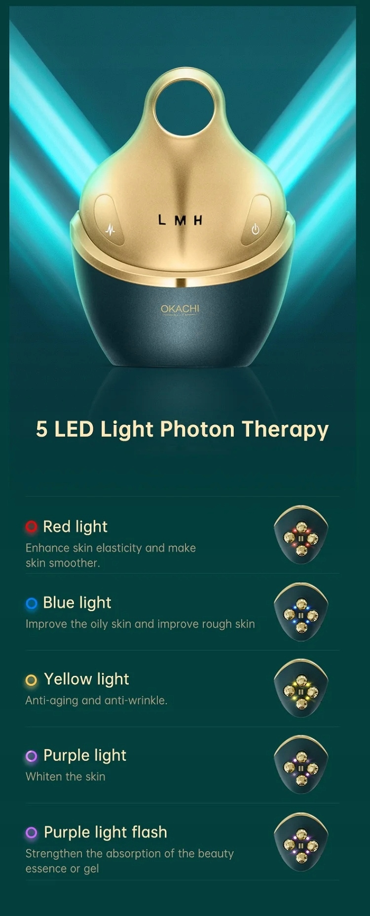 - Светодиодная фототерапия: Пять режимов светодиодного освещения разных цветов, каждый из которых по-разному влияет на кожу: