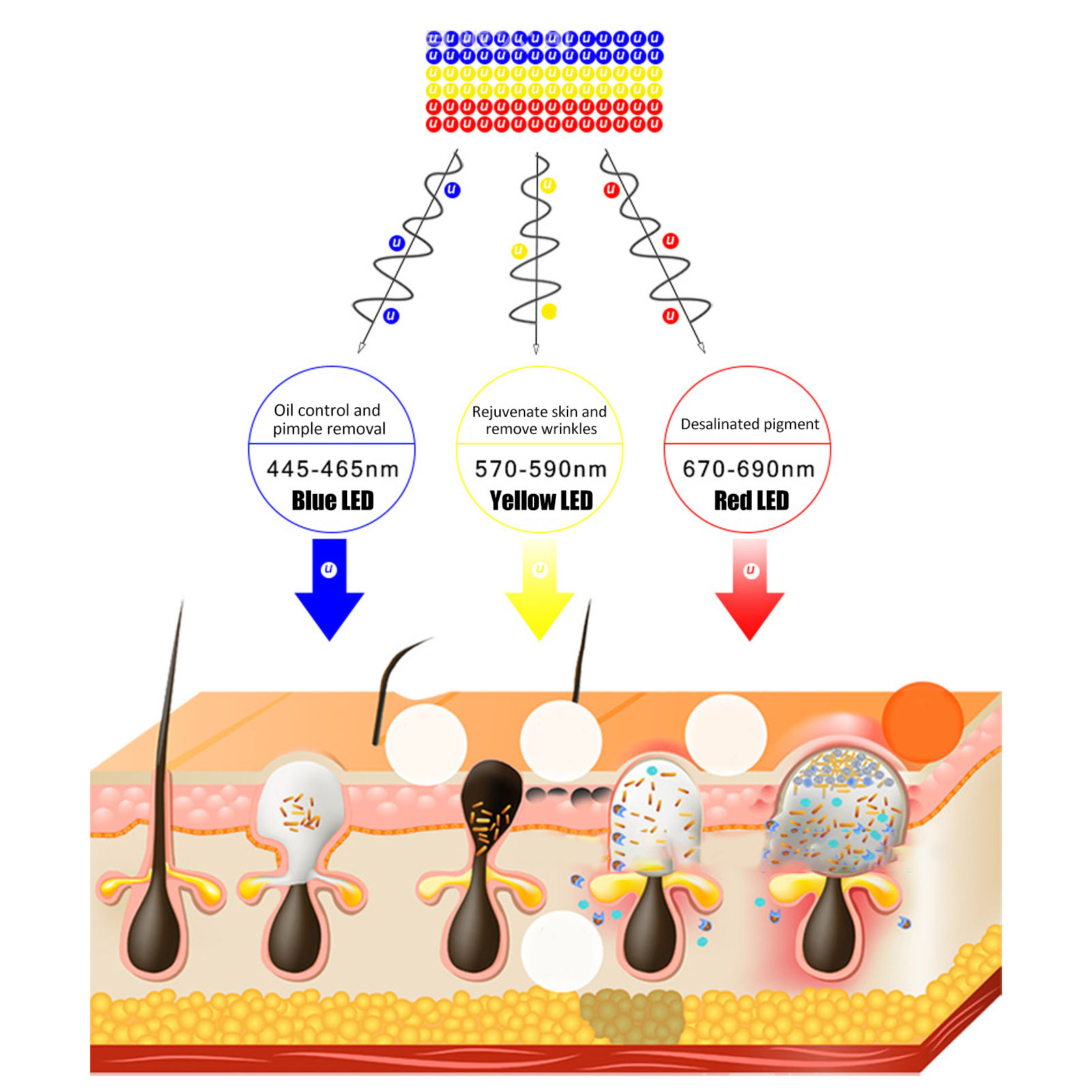 1. СВЕТОДИОДНЫЙ СВЕТ: Красный светодиод улучшает активность клеток и удаляет прыщи и пятна. Желтый светодиод оказывает разглаживающее и укрепляющее действие, а синий светодиод восстанавливает эластичность волокон, что оказывает успокаивающее действие на чувствительную кожу.