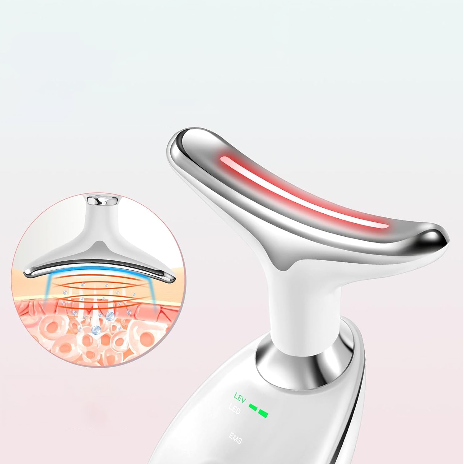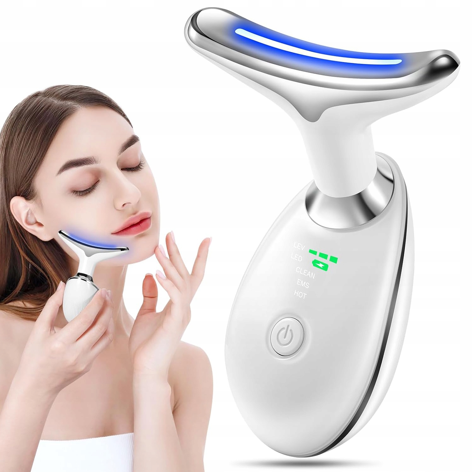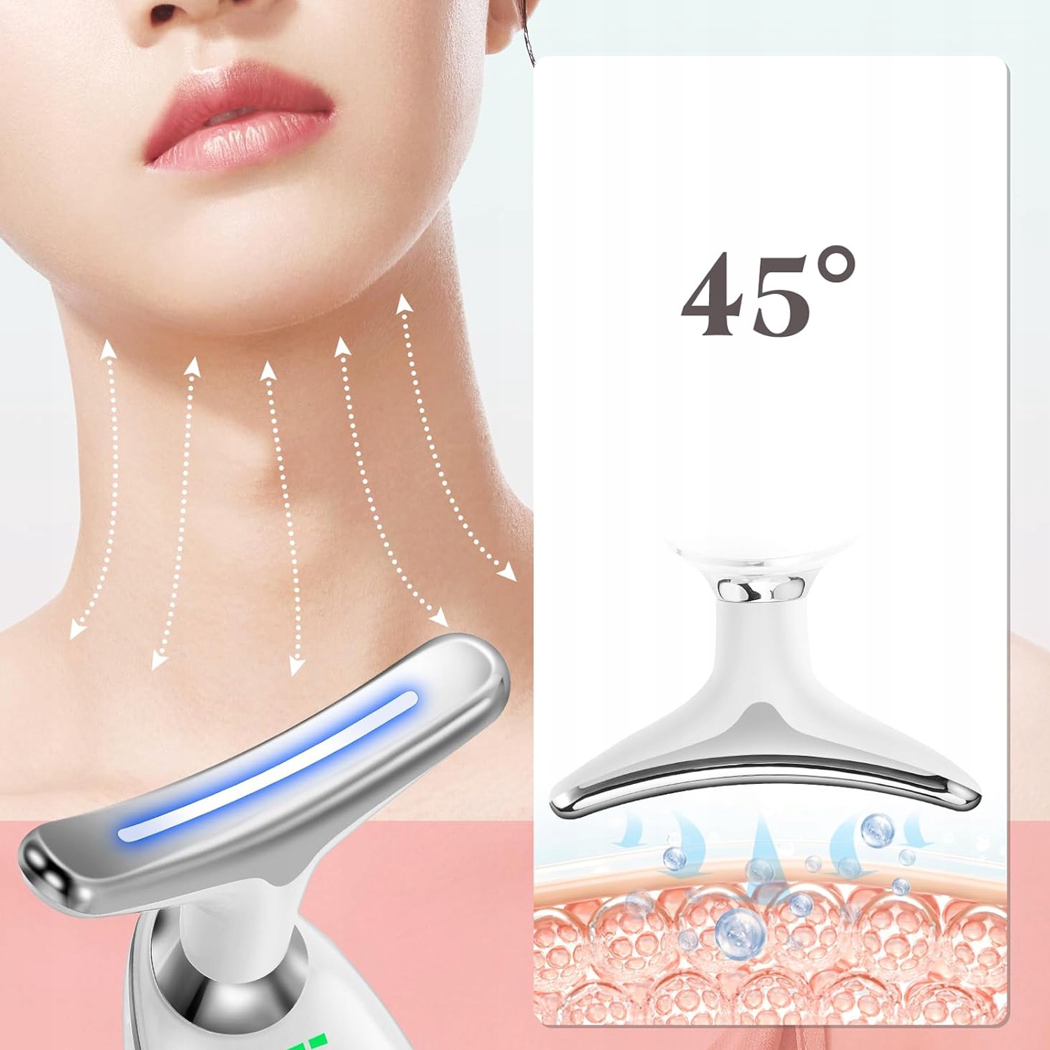 - Это Устройство для подтяжки кожи подходит не только для шеи, но и для лица, лба и других частей тела. Изгиб массажной головки на 160° идеально подходит для лица и шеи, что позволяет уменьшить морщины, массировать линию подбородка и подтянуть кожу лица. Подходит для всех типов кожи.