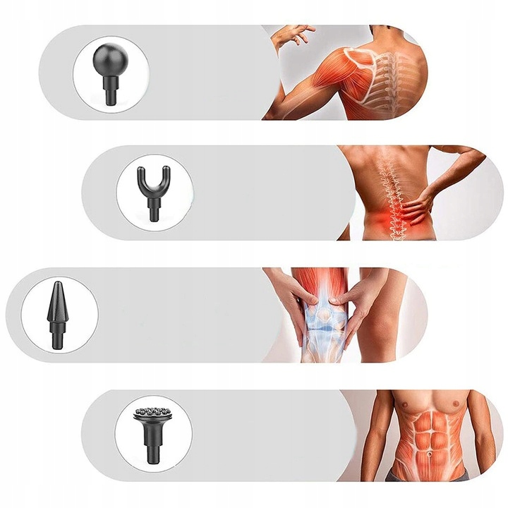 1. Голова предназначена для массажа всех частей тела и используется для поверхностной работы с умеренной интенсивностью. Более узкие и длинные мышцы (например, Это также хорошо работает в тканевой терапии вокруг ахиллового сухожилия, где он позволяет вам работать над тканью, которая обходит сухожилие. Окружные окончания кончика заставляют наконечник плавно двигаться на теле и полностью достигают тех групп мышц, для которых он предназначен. Полем Изготовлен из твердого пластика и предназначенного для триггерных точек (комки на мышечной ткани, вызывающая боль, часто излучаясь в другие области тела). Осторожно достигает самых сложных групп мышц. Он обеспечивает очень хороший контакт с организмом, позволяя вам достичь более глубоких тканей. Также полезно в работе на более напряженных и компактных мышечных частях, таких как мышца четырех бедер или грудь больше