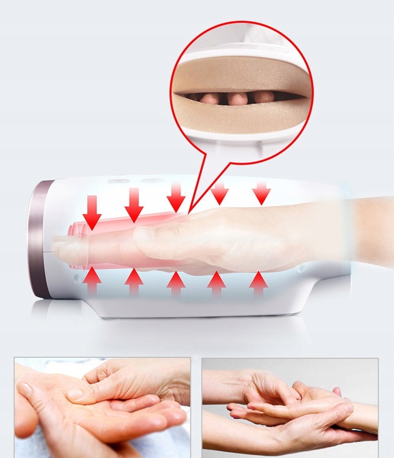 - В массажере используется компрессионный массаж. с помощью горячих компрессов, чтобы расслабить каждую часть руки и воздействовать на пальцы и костяшки пальцев, обеспечивая глубокую релаксацию. Теплый массаж рук улучшает кровообращение, успокаивает мышцы, уменьшает усталость рук, дискомфорт, боль, онемение и холод в пальцах и кисти.