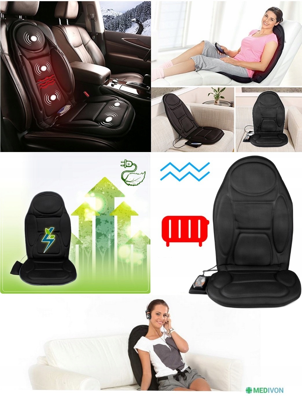 Новый массирующий коврик - массажер с нагреванием Medivon CF2602 Cosy Mesh Black, проводной пилот, 230 В питания сети и автомобиль 12 В с заглушкой с более легким сокетом, руководством пользователя в лаке, оригинальном профессиональном упаковке Medivon