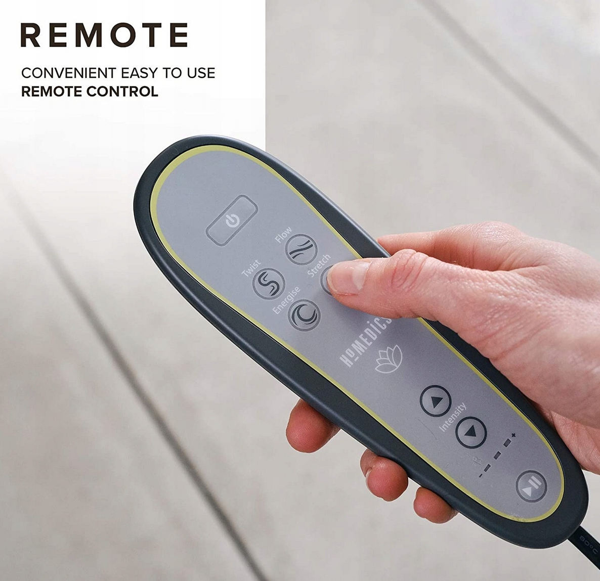 Простое управление, дистанционное управление с регулируемой интенсивностью. Простое интегрированное управление для работы на ходу с расслабляющей программой лечения. Ставьте на паузу, играйте и настраивайте интенсивность каждой растяжки.