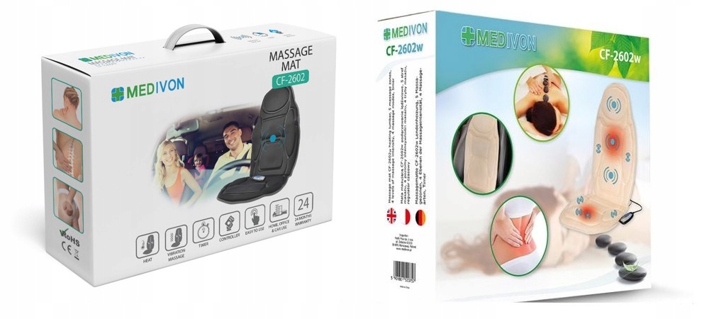 Новый массажно-согревающий коврик для массажера спины MEDIVON CF-2602W ВНИМАНИЕ! В наличии только бежевый цвет, Проводной пульт дистанционного управления, сетевой адаптер 230 В и автомобильный адаптер 12 В с вилкой прикуривателя, Руководство пользователя на польском языке, Оригинальная упаковка MEDIVON EDITION